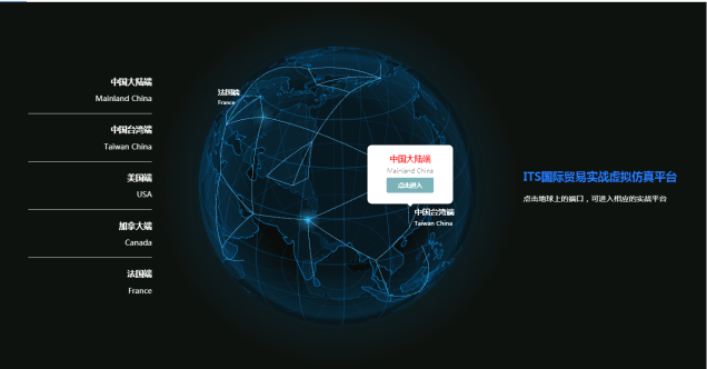 實驗在多個實驗端口同時開展,如“中國端”、“美國端”、 “加拿大端”、“法國端”等。學生根據所在地在相應的端口注冊成立虛擬公司,以公司經營團隊的身份,在開放仿真的國際商務環境中自主運作國際貿易公司,全方位模擬真實企業的國際貨物買賣活動。
