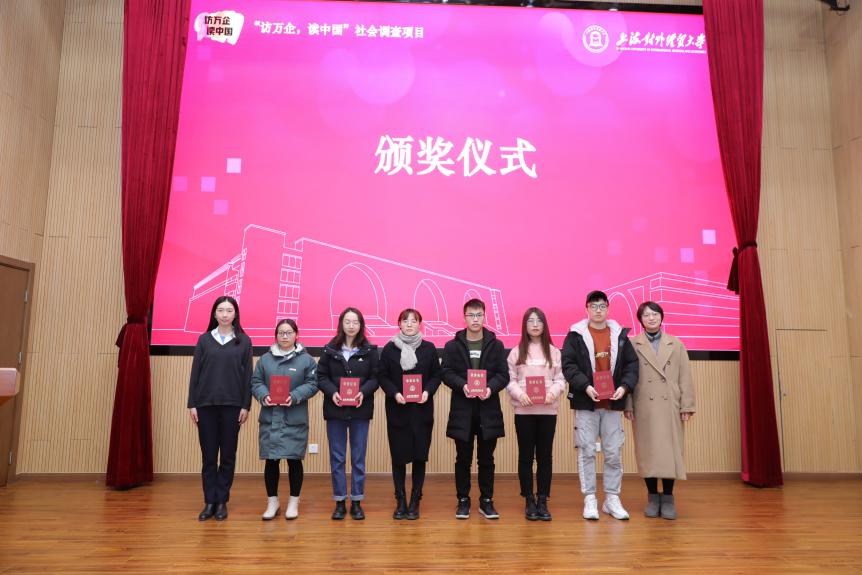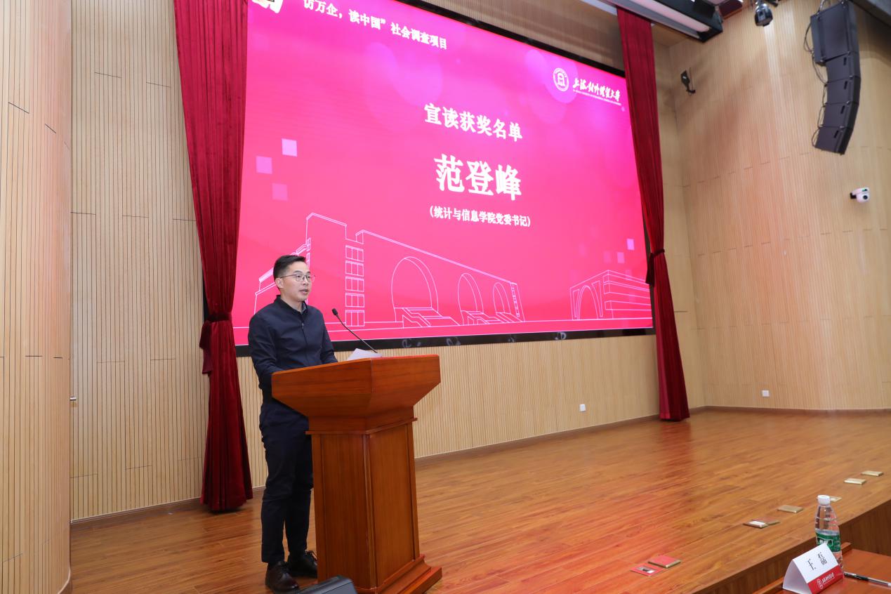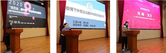 隨后,范登峰宣讀2020年“訪萬企,讀中國”社會調查項目獲獎名單,與會領導嘉賓分別為獲獎隊伍頒獎。劉峰老師作為指導教師代表進行發言。項目團隊代表以“新冠肺炎疫情下外貿企業的數字化轉型”為主題展示了實踐成果。