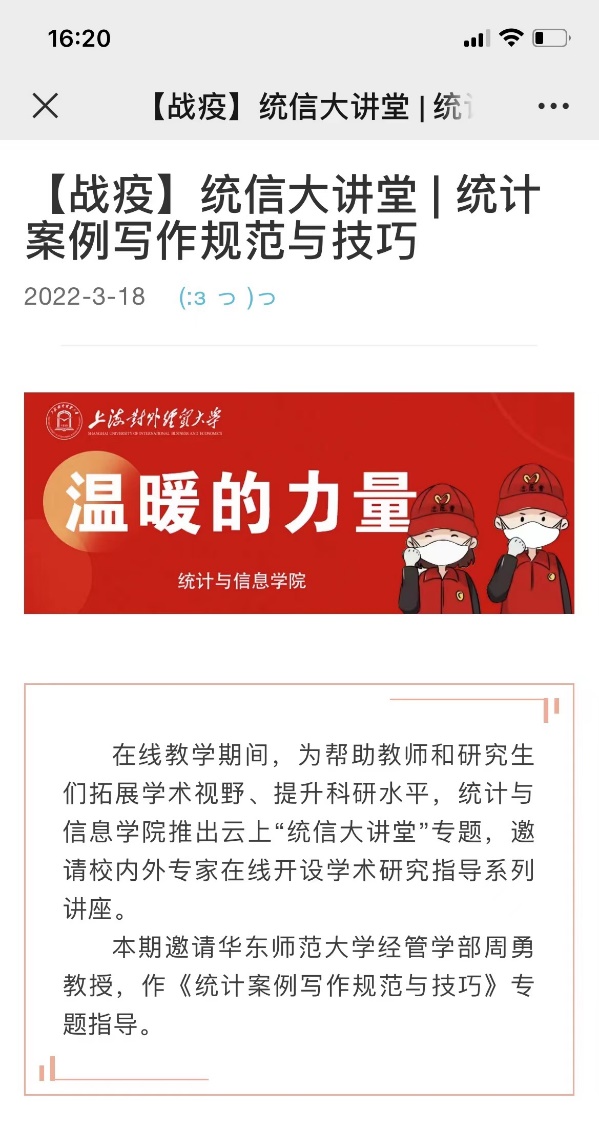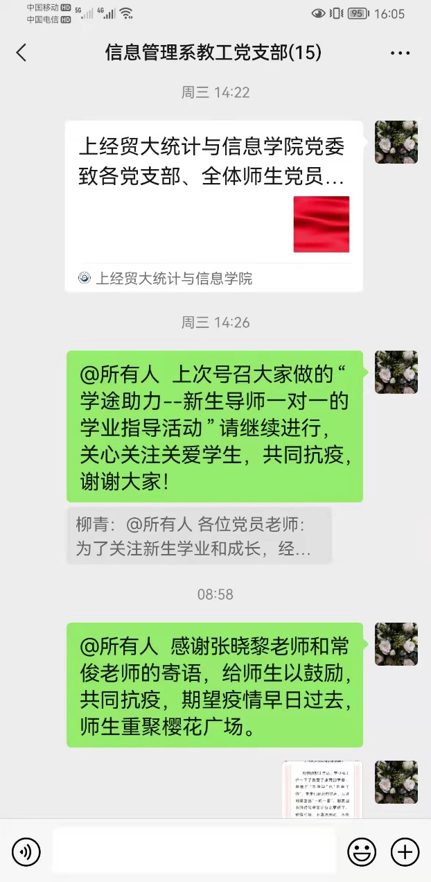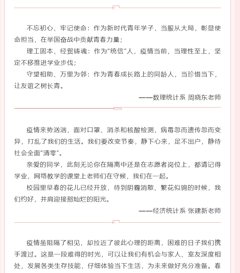 “一課一策”,全力保障在線教學。為確保在線教學期間人才培養(yǎng)“不斷線、不降質”,學院黨委加強線上教育教學質量監(jiān)控,成立在線教學質量工作保障組,結合課程要求和學生在線學習實際情況,做好在線教學和學業(yè)指導方案。學院全體教師嚴格按照在線教學要求,以飽滿的熱情、認真的態(tài)度投入到教學中。教師支部組織教師交流研討在線教學工作,不斷改進教學方法,不斷加強師生互動,讓學生云端學習有收獲、有溫度。分類指導,開展“云上課程幫”“云上統(tǒng)信大講堂”。針對學生在線學習過程中的實際需要,教師黨支部開展“云上課程幫”活動,應用數(shù)學系教工黨支部康悅明、張澍軼、李瑞囡、劉海、劉忠莉、周大鵬等6位教師主動組團開設高等數(shù)學等課程指導系列講座,助力學生高效在線學習;開展“云上統(tǒng)信大講堂”,各系教師陸續(xù)邀請校內外專家開設學術科研講座,幫助學生提升在線教學期間的學術科研水平。結對幫扶,教師暖心辦實事。師生黨支部建立導師結對機制,教師們主動關心學生的學業(yè)發(fā)展、居家生活、心理狀況等。信息管理系、經濟統(tǒng)計系、數(shù)據(jù)科學系教工黨支部紛紛明確要求,號召教師們“一對一”全覆蓋通過電話、微信等方式與學生進行溝通交流。數(shù)理統(tǒng)計系教工黨支部書記趙霞老師提醒支部每一位老師,要特別關心學業(yè)困難和就業(yè)困難的學生,給予專項幫助。為鼓勵同學們堅定信心、共渡難關,學院教師們主動通過微信公眾號向同學們寄語,優(yōu)秀黨務工作者張建新、“師德標兵”周曉東等近20位老師對同學們諄諄提醒、深深關切,溫暖人心的話語,給同學們注入了強大的勇氣和力量。