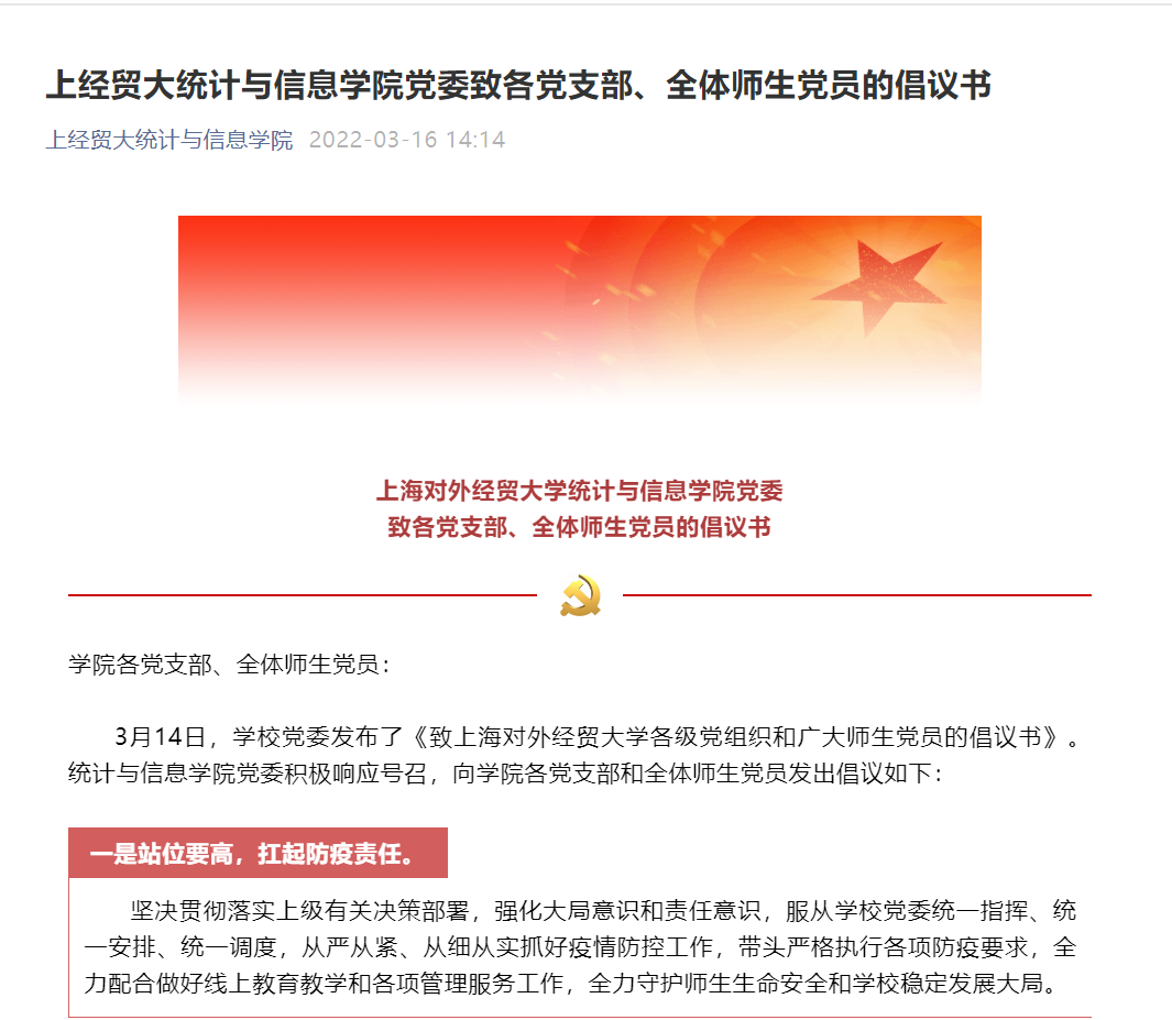 一名黨員就是一面旗幟,一個支部就是一座堡壘。當疫情洶涌來襲,上經貿大統(tǒng)計與信息學院黨委、黨支部、黨員立即行動起來,亮身份、勇?lián)敗⒆鱿蠕h,團結帶領全院師生戮力同心、共克時艱,共同守護健康平安的校園。