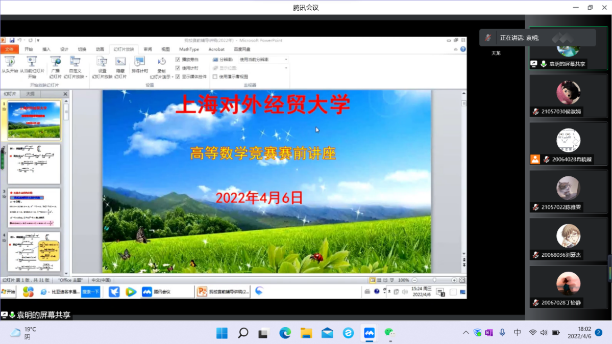 會議開始時,袁老師給大家介紹了高數競賽的基本事項。之后,袁老師以例題為基礎,給我們講解了很多解題方法和技巧,不僅讓同學們對考題方向有了一定的了解,也豐富了大家的知識儲量。