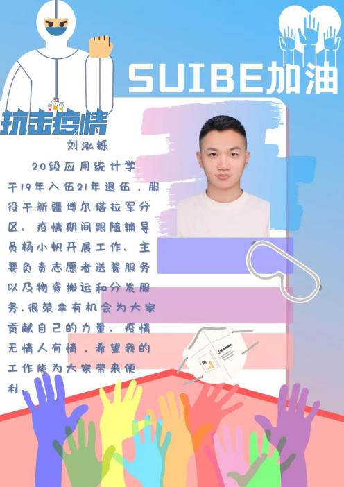 劉泓鑠就讀于20級應用統計學專業,19年入伍21年退伍,服役于新疆博爾塔拉軍分區。他于三月十一日報名志愿者,同輔導員楊小帆開展志愿服務。他的主要工作是擔任疫情期間的志愿者送餐服務及統計與信息學院的物資搬運和分發服務。