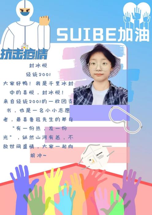 封冰悅是經濟統計學1班的團支書,她參與了社區清潔、滾動核酸晚餐志愿者等多個志愿活動。她最喜歡的魯迅先生那句“一份熱,發一份光”,她堅信,縱然山河有恙,不敵世間盛情,同學們定能一起共度這次難關。