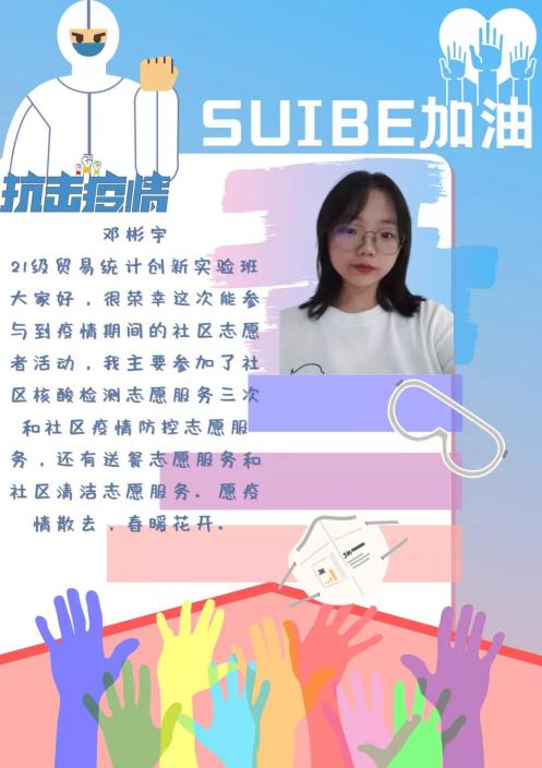 鄧彬宇來自21級貿易統計創新實驗班。在本次疫情封校期間,她多次參加了社區核酸檢測志愿者服務、社區疫情防控志愿者服務、送餐志愿者服務和社區清潔志愿服務。之后也會繼續參加滾動核酸檢測志愿者管理以及核酸檢測秩序協調工作。她說:“烏云遮不住太陽的升起,疫情擋不住春天的來臨,相信都會好起來的。”