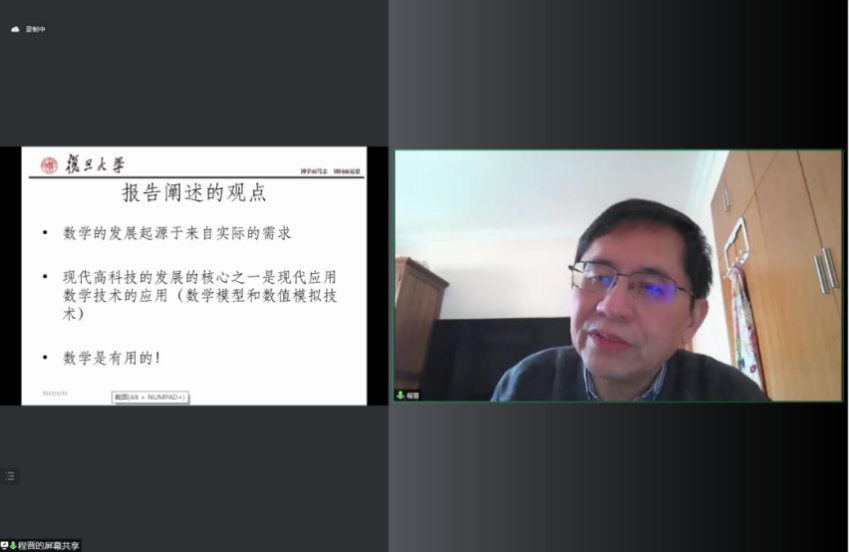 講座中,程晉教授由淺入深地講解了問題與反問題的概念與重要意義,通過其自身的相關經歷為同學們闡明了數學模型和數值模擬技術在數學應用中的核心地位,將反問題由果求因的內涵直觀地呈現在大家眼前,原本枯燥乏味的數學原理被講解得簡潔、生動。針對當下疫情,程教授也和同學們分享了近期的研究成果。在講座中,程教授也不忘鼓勵同學們在疫情期間也要努力學習,號召大家學好數學,打好扎實的數理基礎。