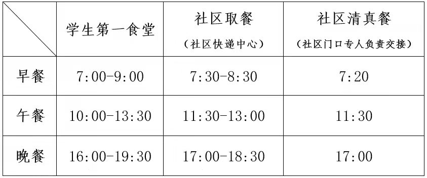 準(zhǔn)封閉管理期間松江校區(qū)開放學(xué)生第一食堂,供應(yīng)A、B兩種套餐,提供堂食、打包分餐和社區(qū)送餐、取餐服務(wù),可根據(jù)個人需要自行購買。具體時間安排如下: