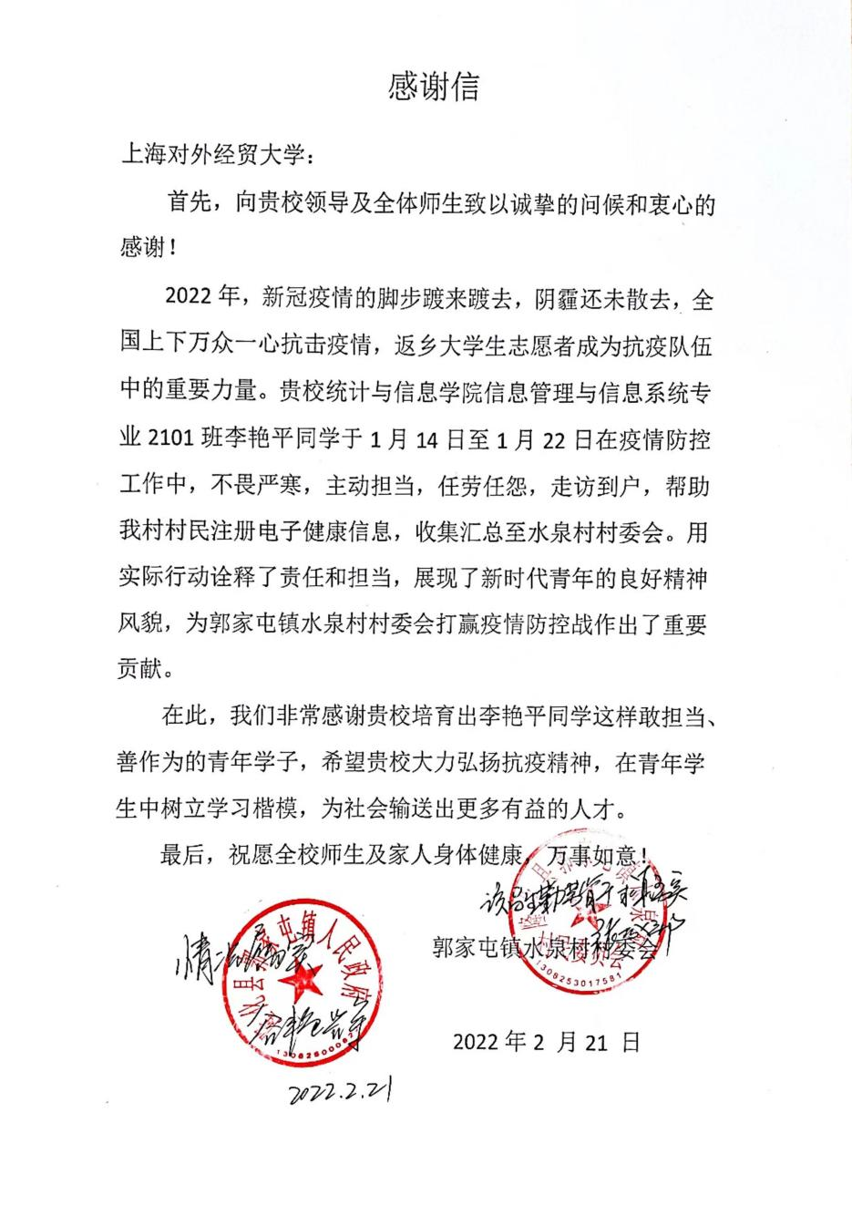 近日,我們收到一封來自河北省承德市隆化縣郭家屯兒鎮(zhèn)水泉村村委會的一封來信,表揚和感謝我院信息管理與信息系統(tǒng)專業(yè)李艷平同學(xué)在村委會疫情防控工作中作出的重要貢獻(xiàn)。