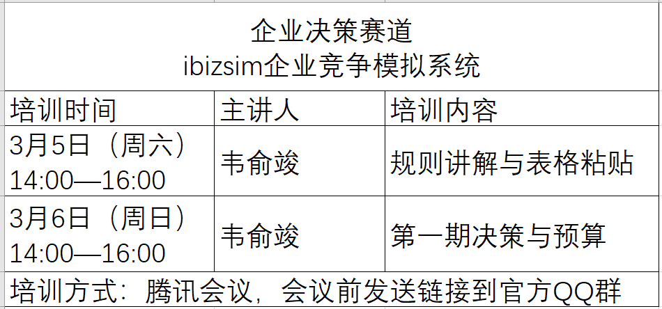 2022年全國企業競爭模擬大賽已經啟動,校內初賽截止到3月20日,全國復賽報名截止到3月27日。本屆大賽分為企業決策賽道和企業運營賽道,本科生、研究生和MBA學生可以參加企業決策賽道,專科生和本科生可以參加企業運營賽道。為了幫助大家熟悉比賽平臺,提升參賽水平,競賽組委會近期將開展系列線上培訓,望同學們積極參加。