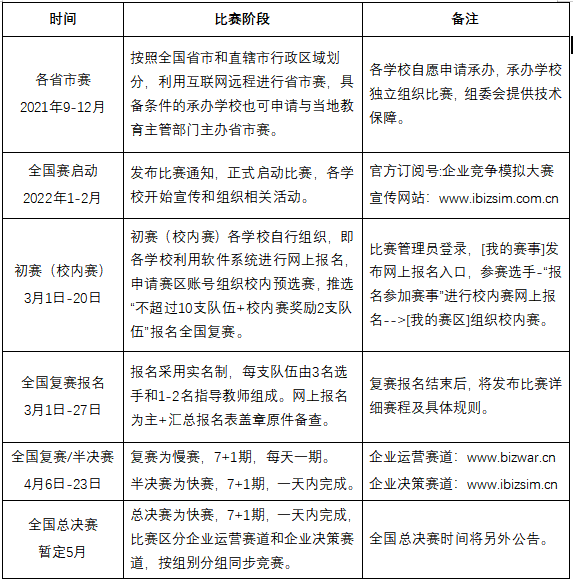 為了貫徹全國教育大會和全國研究生教育會議精神,全面落實《教育部關于加快建設高水平本科教育全面提高人員培養能力的建議》、《加快推進教育現代化實施方案(2018-2022年)》有關要求,開展實踐育人,加強就業與創業教育,推動經濟管理類專業的實踐教學改革,以及高校專業學位研究生教育高質量和內涵式發展,培養新型創新復合型人才,競賽組委會研究決定擬繼續舉辦“2022年全國企業競爭模擬大賽”。比賽分為校內初賽、全國復賽、全國半決賽、全國總決賽共四個階段,涉及企業運營和企業決策兩個賽道,涵蓋高職組、本科組、研究生組三個組別,利用互聯網遠程進行。