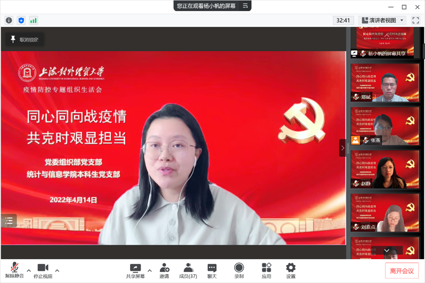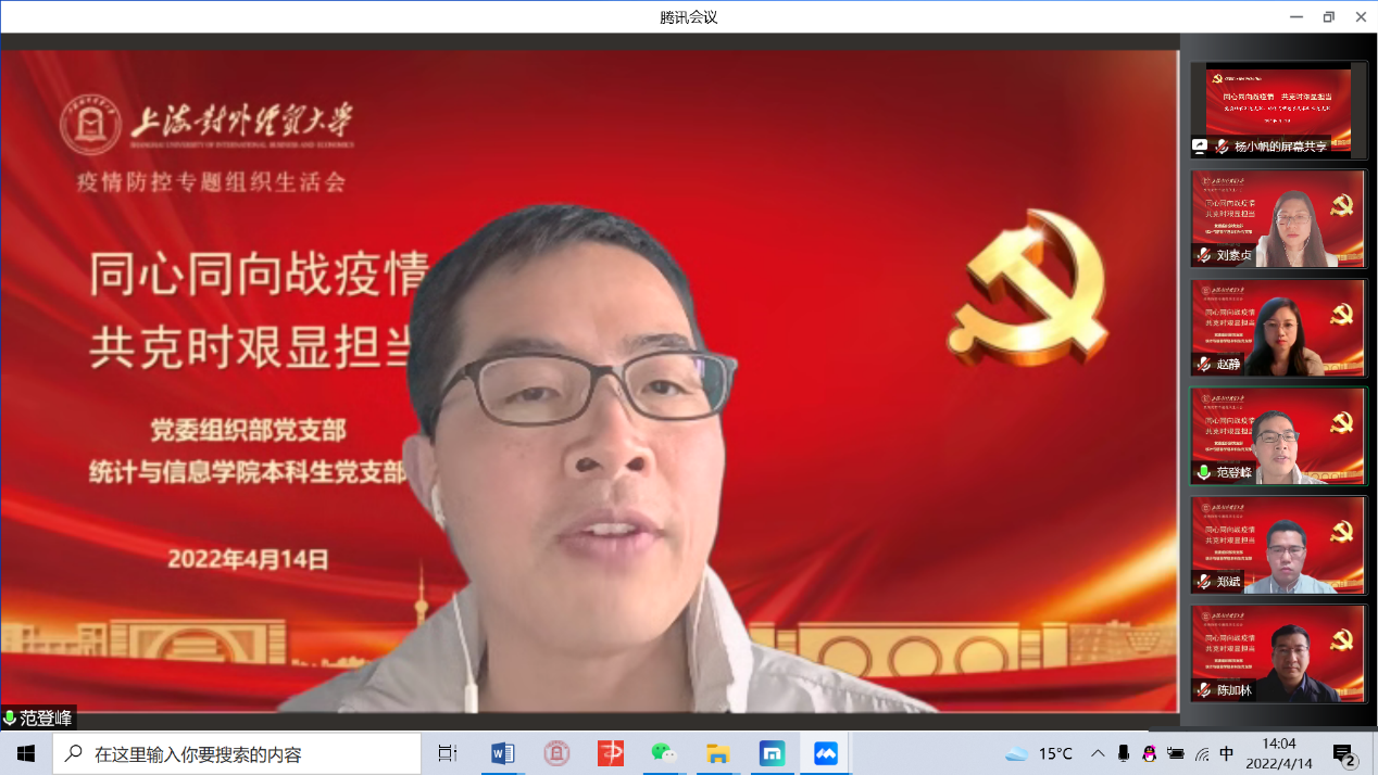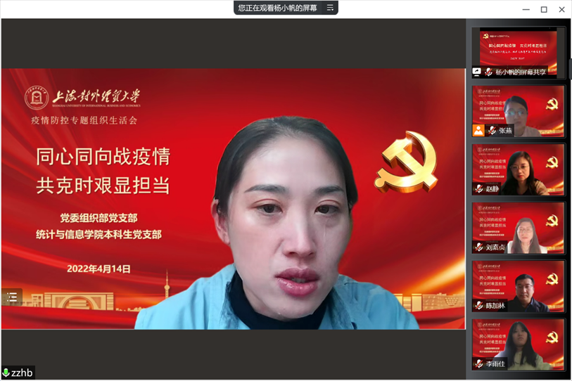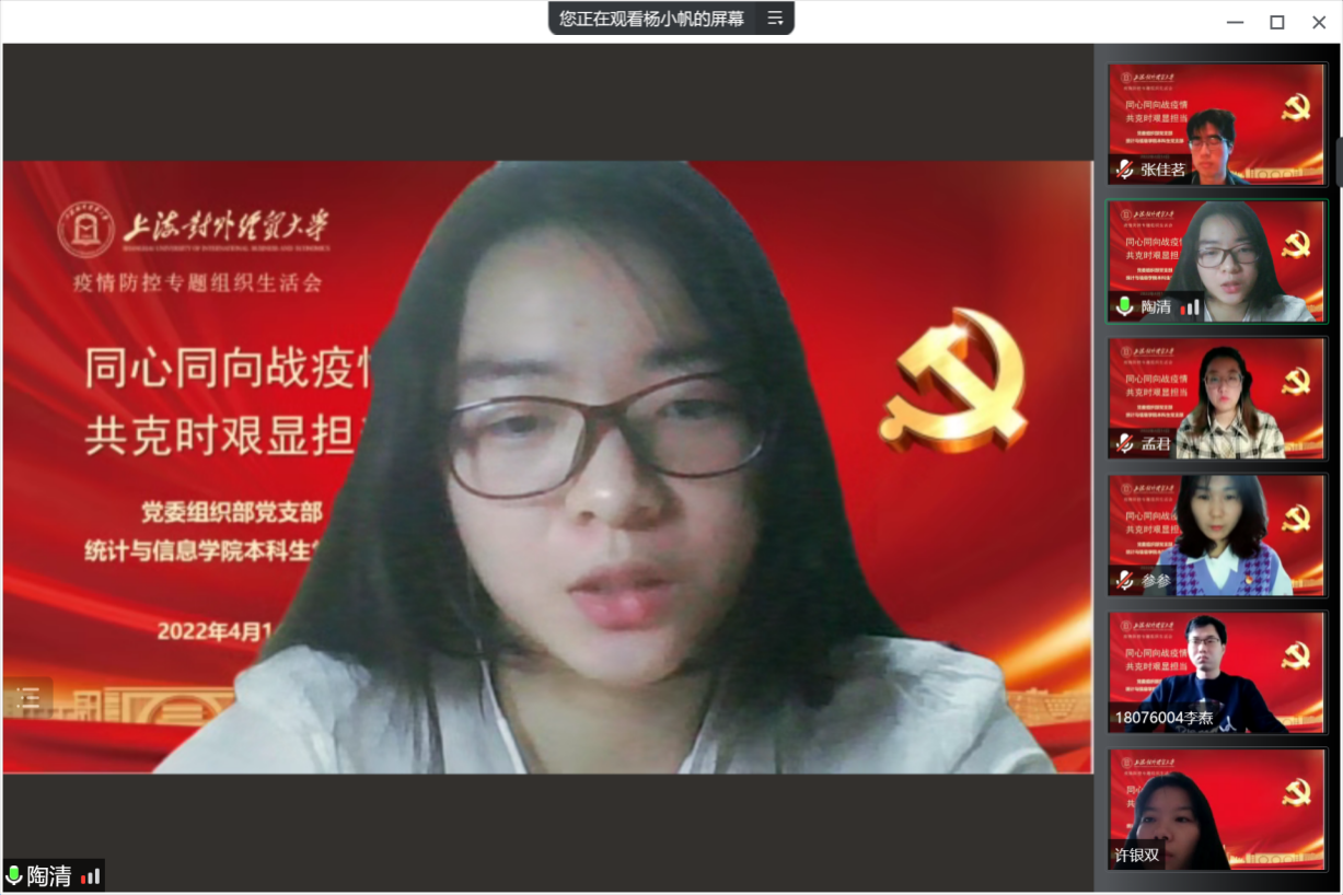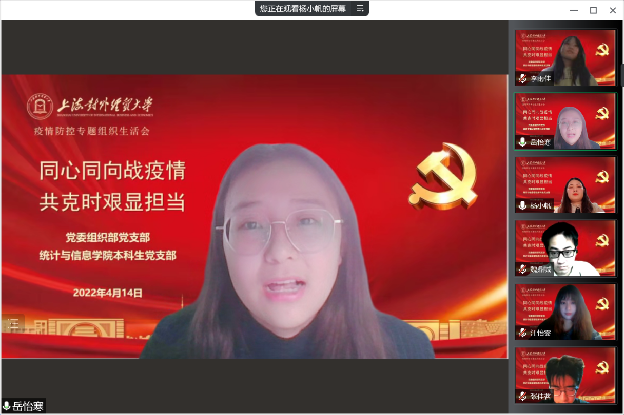 4月14日下午,黨委組織部黨支部和統(tǒng)計(jì)與信息學(xué)院本科生黨支部以“同心同向戰(zhàn)疫情 共克時(shí)艱顯擔(dān)當(dāng)”為主題,聯(lián)組在線召開疫情防控專題組織生活會(huì),校黨委副書記吳毅參加組織生活會(huì)并做專題黨課。會(huì)議由統(tǒng)計(jì)與信息學(xué)院本科生黨支部書記、輔導(dǎo)員楊小帆主持。