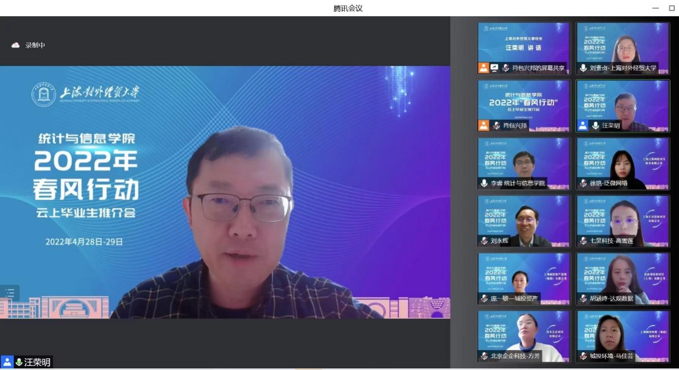 “我們向各用人單位推薦我校統(tǒng)計與信息學(xué)院2022屆研究生畢業(yè)生唐汝佳同學(xué),她在方艙醫(yī)院隔離時期主動擔(dān)任志愿者,她的事跡被文匯報、央廣網(wǎng)等十余家媒體爭相報道,是一位非常有擔(dān)當(dāng)有使命感的優(yōu)秀畢業(yè)生,是企業(yè)最需要的人才!”在上海對外經(jīng)貿(mào)大學(xué)統(tǒng)計與信息學(xué)院4月28日舉行的“春風(fēng)行動”——云上畢業(yè)生推介會上,校長汪榮明和統(tǒng)計與信息學(xué)院院長劉永輝通過直播的形式向15家用人單位點名推薦剛剛從方艙醫(yī)院隔離歸來的畢業(yè)生唐汝佳同學(xué)。用人單位表示:校長親自帶人就崗,“硬核”直播推薦,這種場面還是第一次見到。