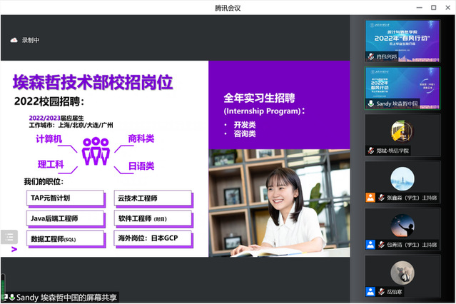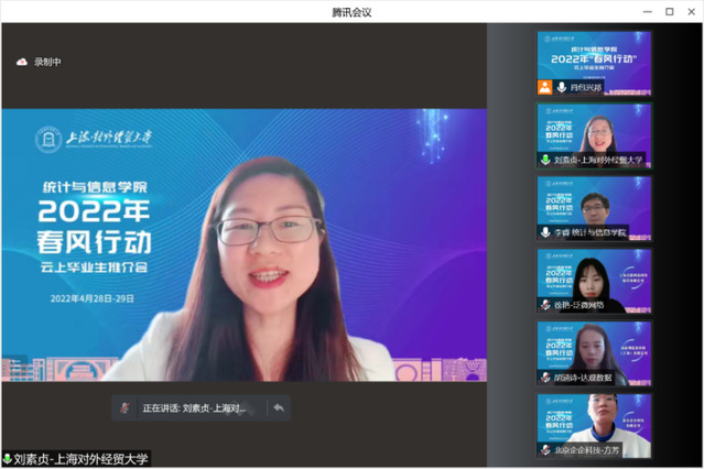 這是上海對外經貿大統計與信息學院推進實施的“春風行動”,為切實促進畢業生更充分、更高質量就業,積極搭建在校畢業生與用人單位精準供需對接的平臺,于2022年4月起每周在線舉辦云上畢業生推介會。首場集中推介會于4月28日和29日兩天滾動舉行,吸引了埃森哲(中國)有限公司、上海投資咨詢集團有限公司、上海泛微網絡科技有限公司等15家用人單位,提供近60個就業崗位。25人初步達成了就業意向,約占招聘崗位的二分之一。