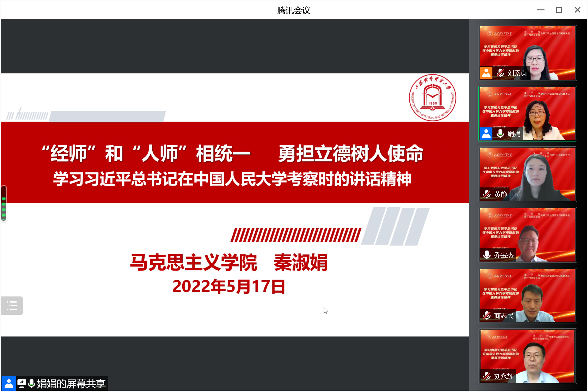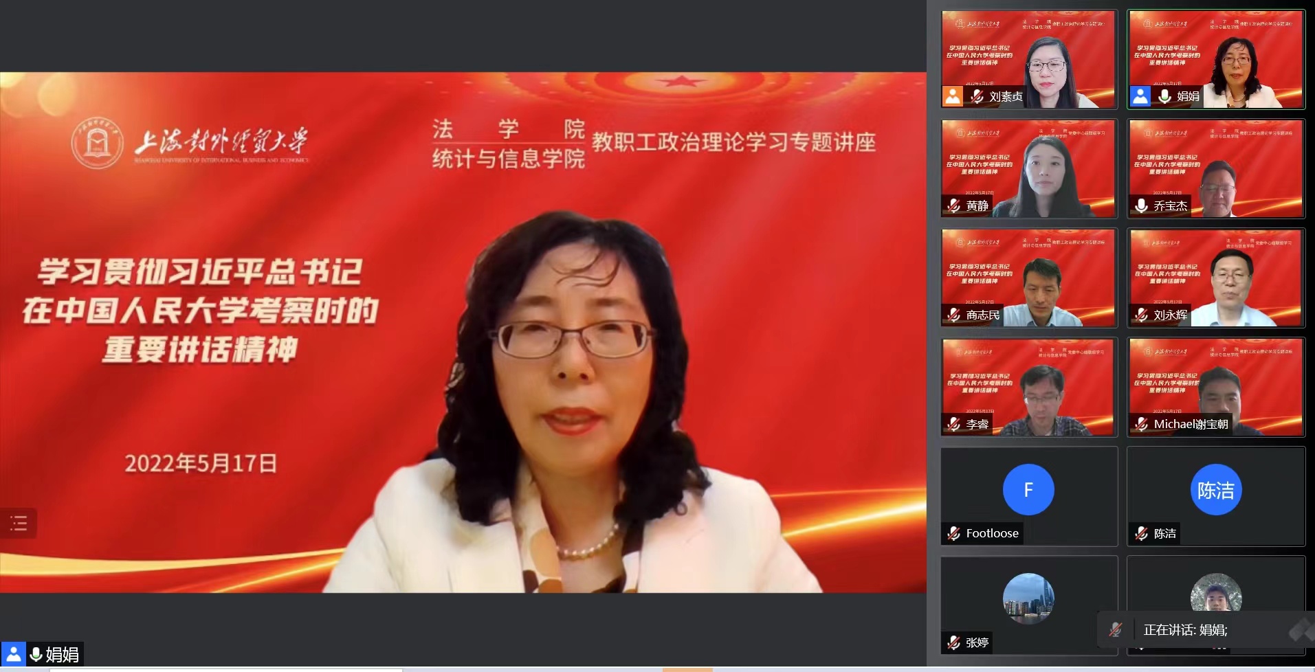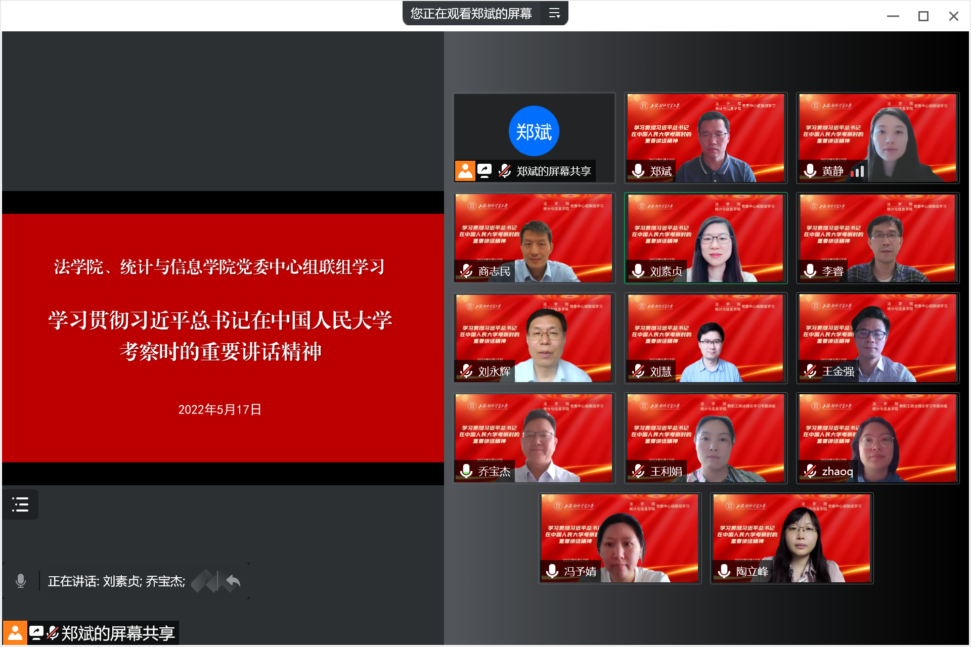 5月17日下午,法學(xué)院、統(tǒng)計與信息學(xué)院在線舉行聯(lián)組學(xué)習(xí),專題學(xué)習(xí)習(xí)近平總書記在中國人民大學(xué)考察時的重要講話精神,馬克思主義學(xué)院院長秦淑娟教授受邀做專題輔導(dǎo)報告,法學(xué)院黨委書記黃靜、院長喬寶杰,統(tǒng)計與信息學(xué)院院長劉永輝、黨委副書記(主持工作)劉素貞,以及兩個學(xué)院領(lǐng)導(dǎo)班子成員、全體教職工共同參加學(xué)習(xí)。會議由劉素貞主持。
