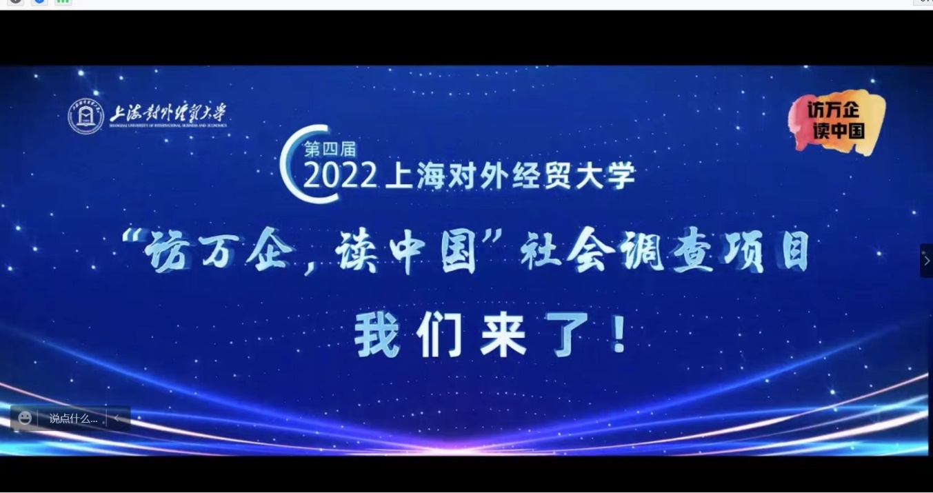會上播放了本次“訪萬企,讀中國”社會調查項目啟動短視頻。 “訪萬企,讀中國”社會調查項目于2019年由上海對外經貿大學發起,由上海對外經貿大學、中國對外經濟貿易統計學會和環球慧思(北京)信息技術有限公司等單位共同組織實施,上海對外經貿大學統計與信息學院承辦,連續三年分別圍繞“優化營商環境,助推外貿企業轉型升級”“新冠肺炎疫情下外貿企業的數字化轉型”“聚焦貿易數字化,助力長三角一體化高質量發展”主題,累計近900名師生深度走訪和調查了近800家企業,開展接力跟蹤式調查研究,形成了近百份調查報告,助推企業轉型發展,服務貿易強國建設,為上海和國家相關部門提供決策參考,獲新華社、人民網、光明日報等十余家媒體宣傳報道,產生了廣泛的社會影響。