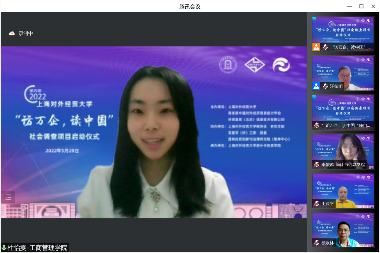 5月28日下午,第四屆“訪萬企,讀中國”社會調查項目啟動儀式在線舉行,中國對外經濟貿易統計學會名譽會長王亞平,環球慧思(北京)信息技術有限公司董事長邵宏華,上海對外經貿大學校長汪榮明,副校長徐永林,學校辦公室、黨委組織部、黨委宣傳部、教務處、研究生院、科研處、黨委學(研)工部、團委、國際經貿創新與治理研究院等相關部門負責人,來自全校各學院的調查項目指導教師、學生隊員共同出席啟動儀式。啟動儀式由統計與信息學院黨委副書記(主持工作)劉素貞主持。