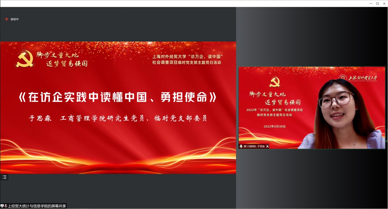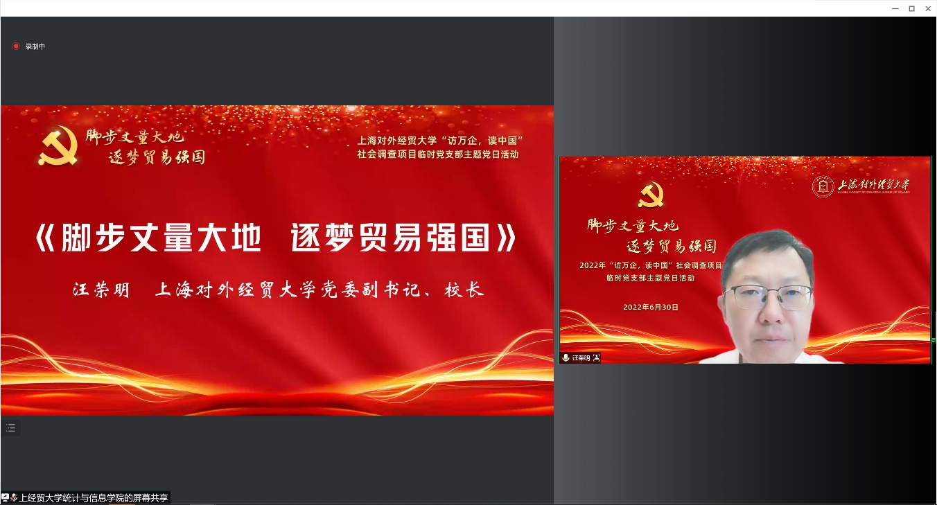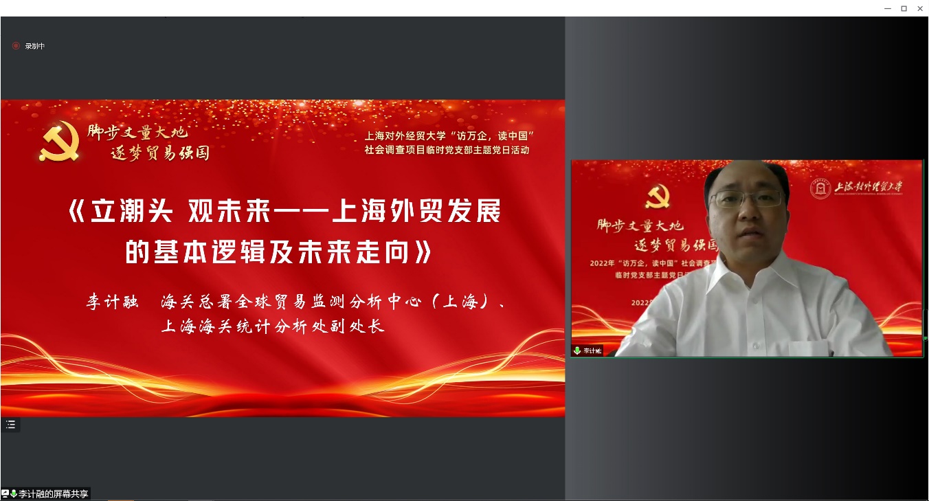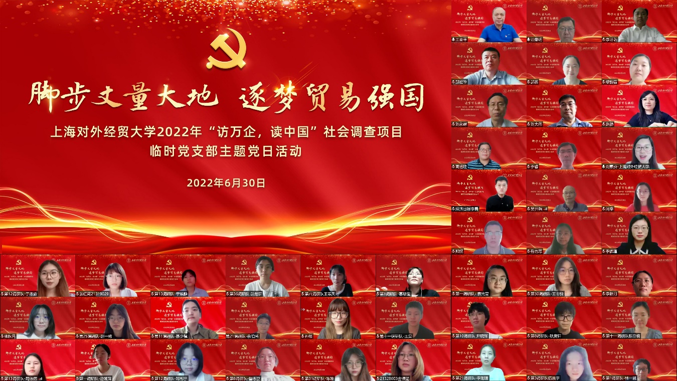 為迎接黨的二十大勝利召開,深入學(xué)習(xí)貫徹上海市第十二次黨代會精神,在建黨101周年來臨之際,6月30日下午,上海對外經(jīng)貿(mào)大學(xué)2022年“訪萬企,讀中國”社會調(diào)查項目臨時黨支部在線開展主題黨日活動,以“腳步丈量大地 逐夢貿(mào)易強國”為主題邀請校內(nèi)外專家開設(shè)專題黨課,激勵參與調(diào)查項目的師生牢記囑托、砥礪奮進(jìn),以黨建領(lǐng)航助推“訪萬企,讀中國”社會調(diào)查項目取得高質(zhì)量成果。