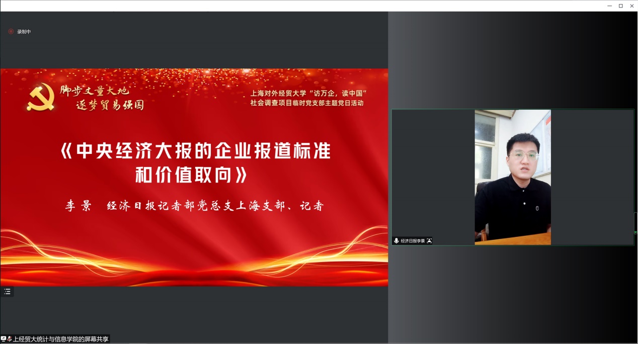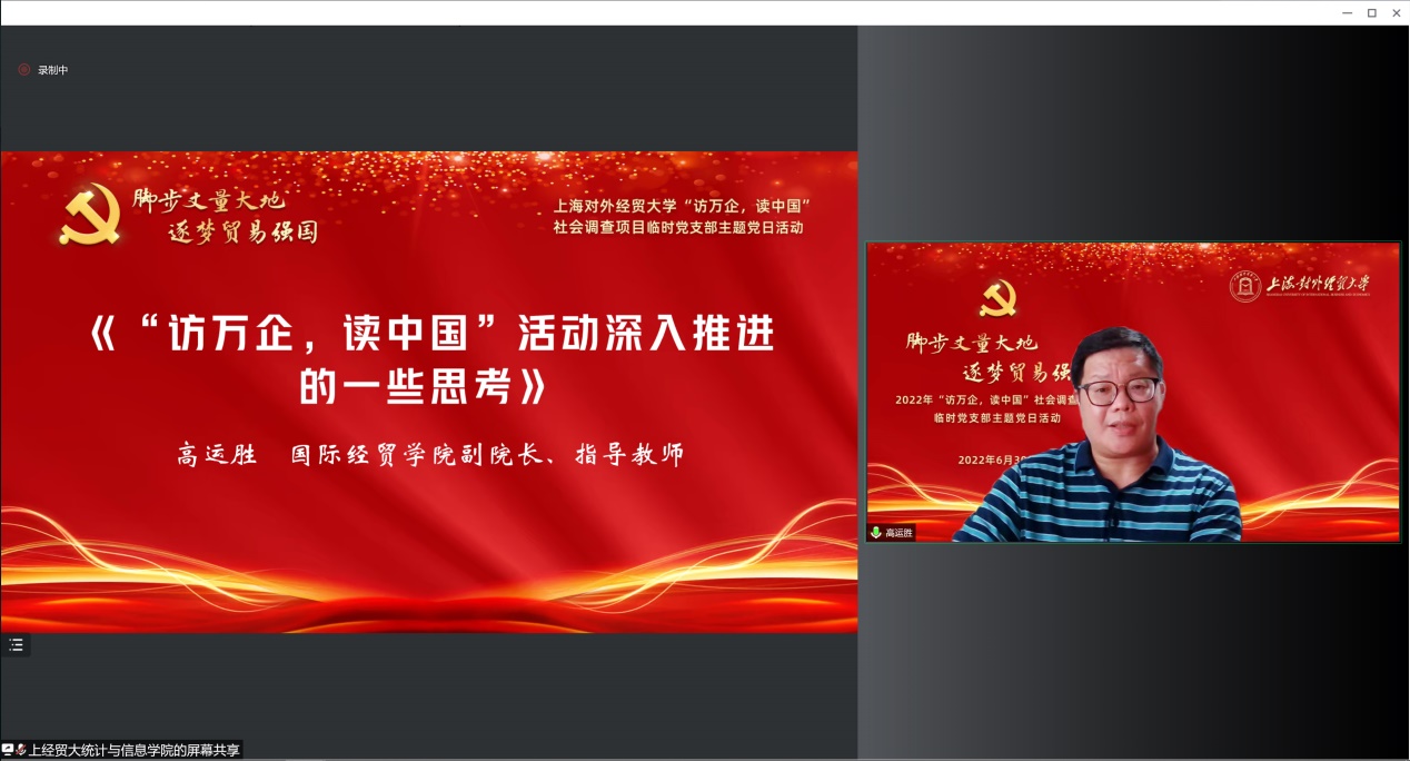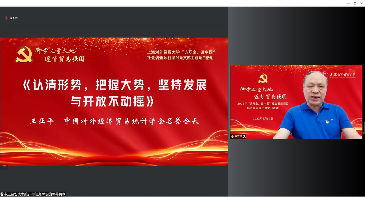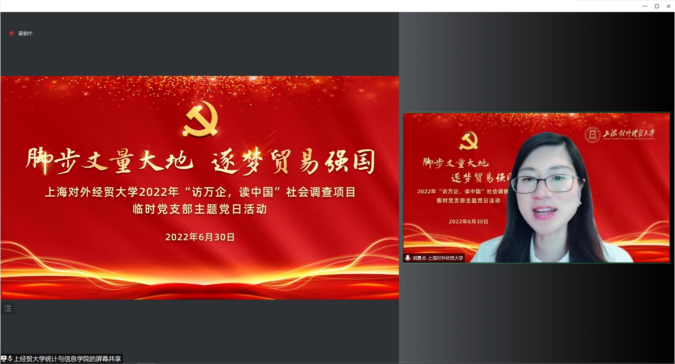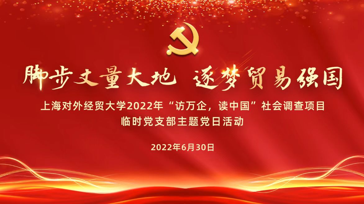 為迎接黨的二十大勝利召開,深入學(xué)習(xí)貫徹上海市第十二次黨代會精神,在建黨101周年來臨之際,6月30日下午,上海對外經(jīng)貿(mào)大學(xué)2022年“訪萬企,讀中國”社會調(diào)查項目臨時黨支部在線開展主題黨日活動,以“腳步丈量大地 逐夢貿(mào)易強國”為主題邀請校內(nèi)外專家開設(shè)專題黨課,激勵參與調(diào)查項目的師生牢記囑托、砥礪奮進(jìn),以黨建領(lǐng)航助推“訪萬企,讀中國”社會調(diào)查項目取得高質(zhì)量成果。