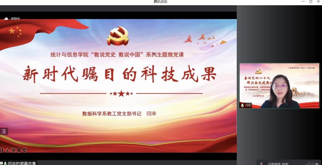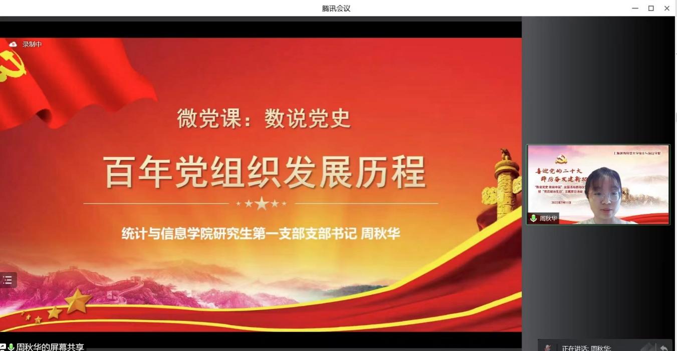 師生黨課環(huán)節(jié),統(tǒng)計(jì)與信息學(xué)院研究生第一黨支部書記周秋華以“數(shù)說(shuō)黨史:百年黨組織發(fā)展歷程”為題,講述了百年來(lái)中國(guó)共產(chǎn)黨黨員和黨組織數(shù)量的變化,以及黨組織發(fā)展壯大的過(guò)程。數(shù)據(jù)科學(xué)系教工黨支部書記閆辛圍繞“數(shù)說(shuō)中國(guó):新時(shí)代矚目的科技成果”主題,回顧了百年來(lái)的中國(guó)科技發(fā)展,尤其是新時(shí)代中國(guó)取得的重大科技創(chuàng)新成果。兩門微黨課運(yùn)用大量詳實(shí)的數(shù)據(jù)和統(tǒng)計(jì)分析方法,帶領(lǐng)與會(huì)師生一起回顧了中國(guó)共產(chǎn)黨的百年奮斗歷程和帶領(lǐng)中國(guó)人民取得的輝煌成就,令人耳目一新。