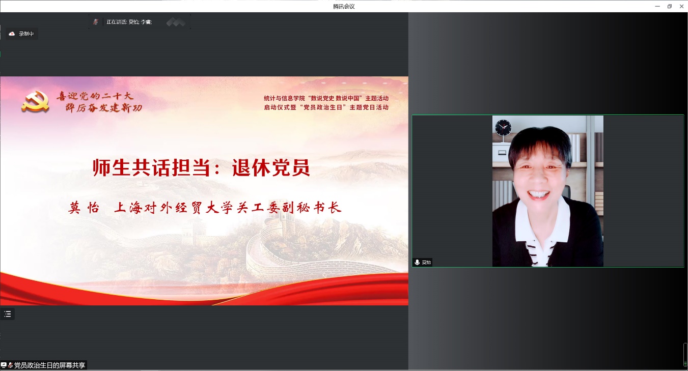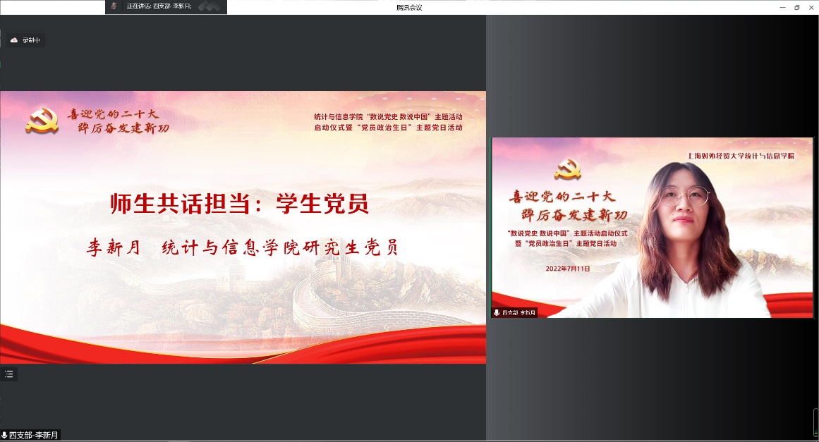 為迎接黨的二十大勝利召開(kāi),深入學(xué)習(xí)貫徹落實(shí)上海市第十二次黨代會(huì)精神,推動(dòng)黨史學(xué)習(xí)教育常態(tài)化長(zhǎng)效化,統(tǒng)計(jì)與信息學(xué)院以“喜迎黨的二十大 踔厲奮發(fā)建新功”為主題,于7月11日下午,在線舉辦“數(shù)說(shuō)黨史 數(shù)說(shuō)中國(guó)”主題活動(dòng)啟動(dòng)儀式暨“黨員政治生日”主題黨日活動(dòng)。校黨委副書(shū)記吳毅出席活動(dòng)并致辭,上海市第十二次黨代會(huì)代表、中共四大紀(jì)念館黨支部副書(shū)記、宣教部主任丁曉,校黨委組織部副部長(zhǎng)趙靜,校關(guān)工委副秘書(shū)長(zhǎng)莫怡,統(tǒng)計(jì)與信息學(xué)院黨委領(lǐng)導(dǎo)班子、全體黨員師生和入黨積極分子近300人共同參加。活動(dòng)由統(tǒng)計(jì)與信息學(xué)院黨委副書(shū)記李睿主持。