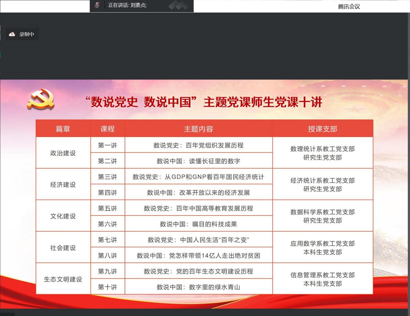 統(tǒng)計(jì)與信息學(xué)院黨委副書(shū)記(主持工作)劉素貞介紹了“數(shù)說(shuō)黨史 數(shù)說(shuō)中國(guó)”主題活動(dòng)概況。學(xué)院黨委發(fā)揮學(xué)科專業(yè)特色,將黨史學(xué)習(xí)教育與統(tǒng)計(jì)學(xué)、大數(shù)據(jù)、人工智能、信息管理、應(yīng)用數(shù)學(xué)等專業(yè)建設(shè)緊密結(jié)合,于2022年5月起開(kāi)展“數(shù)說(shuō)黨史 數(shù)說(shuō)中國(guó)”系列主題活動(dòng),包括專題黨課、黨團(tuán)競(jìng)賽、社會(huì)調(diào)查等項(xiàng)目,鼓勵(lì)師生將所學(xué)專業(yè)知識(shí)運(yùn)用到黨史學(xué)習(xí)教育中去,堅(jiān)定理想信念,砥礪報(bào)國(guó)之志。其中主題黨課由專家黨課和師生黨課兩部分組成,分為“數(shù)說(shuō)黨史”和“數(shù)說(shuō)中國(guó)”兩大專題,圍繞政治建設(shè)、經(jīng)濟(jì)建設(shè)、文化建設(shè)、社會(huì)建設(shè)、生態(tài)文明建設(shè)5個(gè)篇章開(kāi)設(shè)10講課程,包括《百年黨組織發(fā)展歷程》《讀懂長(zhǎng)征里的數(shù)字》《百年國(guó)民經(jīng)濟(jì)統(tǒng)計(jì)》《中國(guó)人民生活的“百年之變”》《數(shù)字里的綠水青山》等內(nèi)容,輻射學(xué)院全體師生。