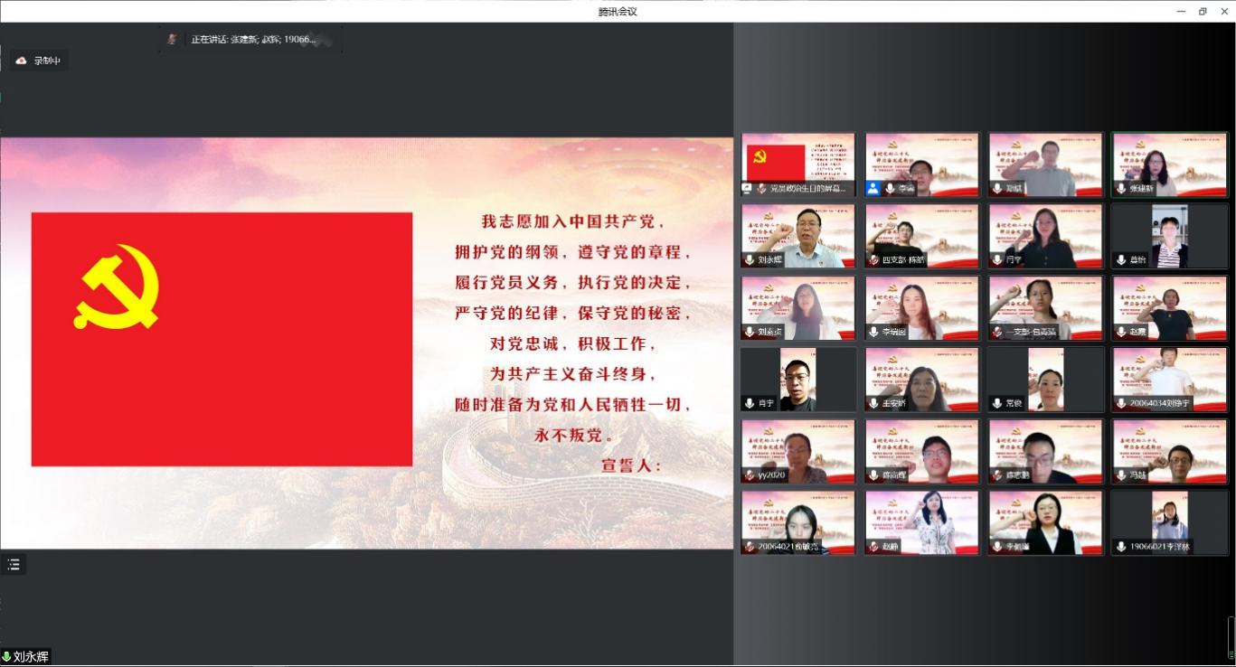 活動(dòng)最后,統(tǒng)計(jì)與信息學(xué)院黨委副書(shū)記、院長(zhǎng)劉永輝領(lǐng)誓,全體與會(huì)黨員在云端重溫入黨誓詞。師生們紛紛表示,本次主題活動(dòng)形式鮮活、內(nèi)容深刻、收獲滿滿,將進(jìn)一步深入學(xué)習(xí)貫徹上海市第十二次黨代會(huì)精神,認(rèn)真學(xué)黨史、知黨史、用黨史,弘揚(yáng)偉大建黨精神,牢記囑托、砥礪奮進(jìn),在學(xué)習(xí)工作生活中爭(zhēng)當(dāng)排頭兵和先行者,為學(xué)院和學(xué)校事業(yè)發(fā)展貢獻(xiàn)智慧和力量,以優(yōu)異的成績(jī)迎接黨的二十大勝利召開(kāi)。