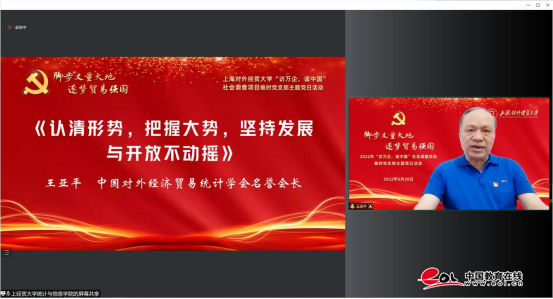 6月30日,臨時黨支部以“腳步丈量大地 逐夢貿易強國”為主題開展黨日活動,校內外專家開設專題黨課,吸引項目組師生,校內外學者等近600人同上一堂黨課。校長汪榮明以《腳步丈量大地 逐夢貿易強國》為題開設導課,他回顧了貿易強國發展歷程,帶領師生感悟新時代的召喚和上經貿大人的責任與擔當。中國對外經濟貿易統計學會名譽會長王亞平和海關總署全球貿易監測分析中心(上海)、上海海關統計分析處副處長李計融分別以《認清形勢,把握大勢,堅持發展與開放不動搖》和《立潮頭 觀未來——上海外貿發展的基本邏輯及未來走向》為題授黨課。主題黨日活動和系列黨課的講授進一步激勵參與調查項目的師生牢記囑托、砥礪奮進,以黨建領航助推“訪萬企,讀中國”社會調查項目取得高質量成果。