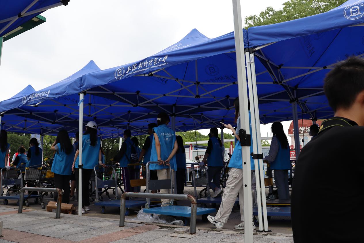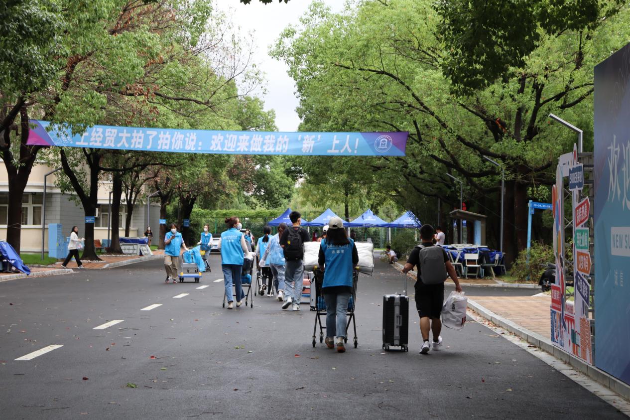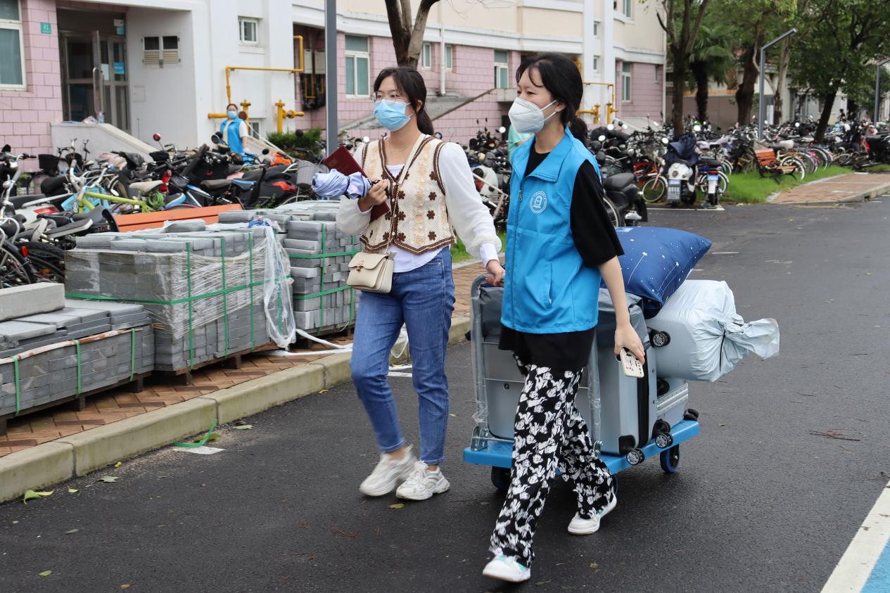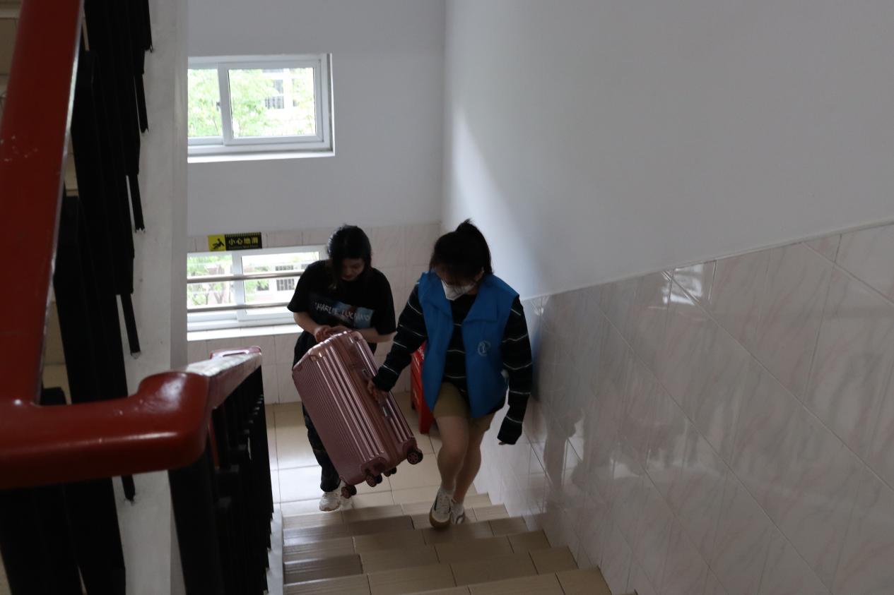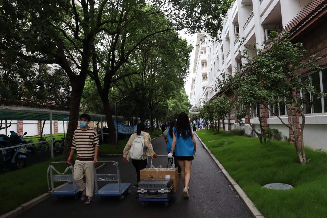 迎新日,比太陽起的更早的,是準(zhǔn)備迎接新生的學(xué)生志愿者和老師們。社區(qū)各大門和主要路口,統(tǒng)一著裝的志愿者們拉著手推車,隨時(shí)做好運(yùn)送行李的準(zhǔn)備。從社區(qū)門口到具體的宿舍樓層,隨處可見志愿者們的忙碌身影,他們耐心地給新同學(xué)指引路線,主動(dòng)幫忙提行李并送到寢室,一站式的貼心服務(wù)展現(xiàn)了他們對(duì)新同學(xué)誠摯的歡