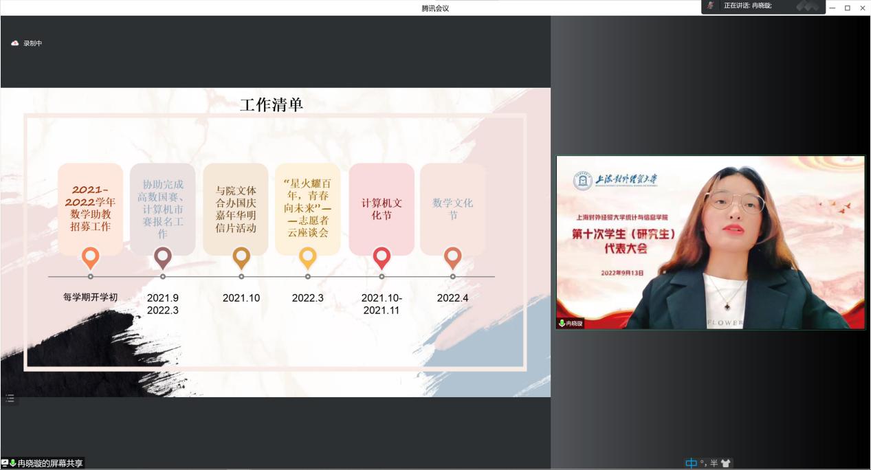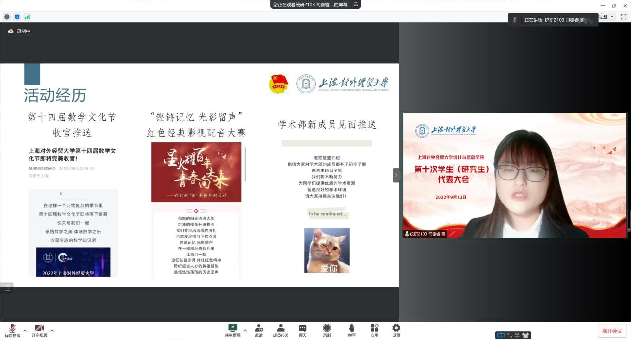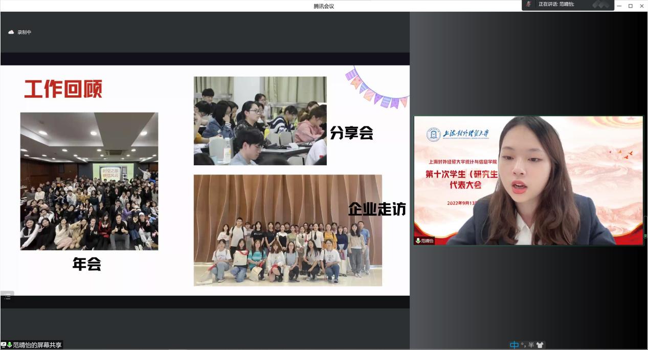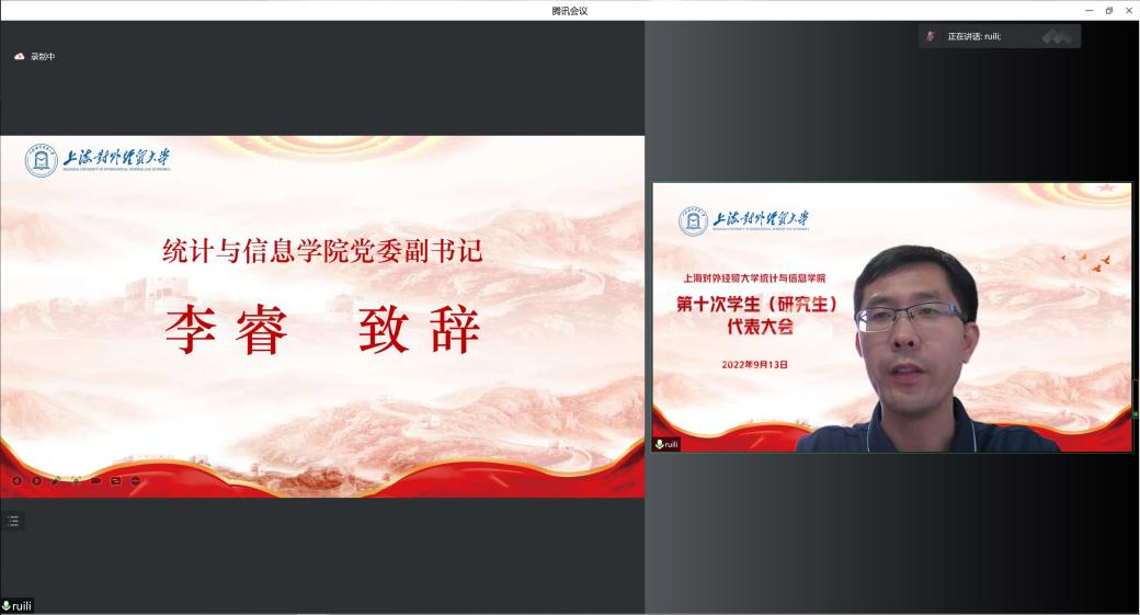 2022年9月13日,上海對外經貿大學統計與信息學院第十次學生(研究生)代表大會在線舉行。上海對外經貿大學統計與信息學院黨委副書記李睿,院團委書記肖包興邦,學生黨建主管馮越,團委副書記岳怡寒,上本科生黨支部書記楊小帆,校學生會主席團成員丁雋儀同學,院學生會主席團成員沈怡佳同學、彭欣怡同學及65位學生、研究生代表出席了本次會議,會議由院團委副書記張君鴻同學主持。