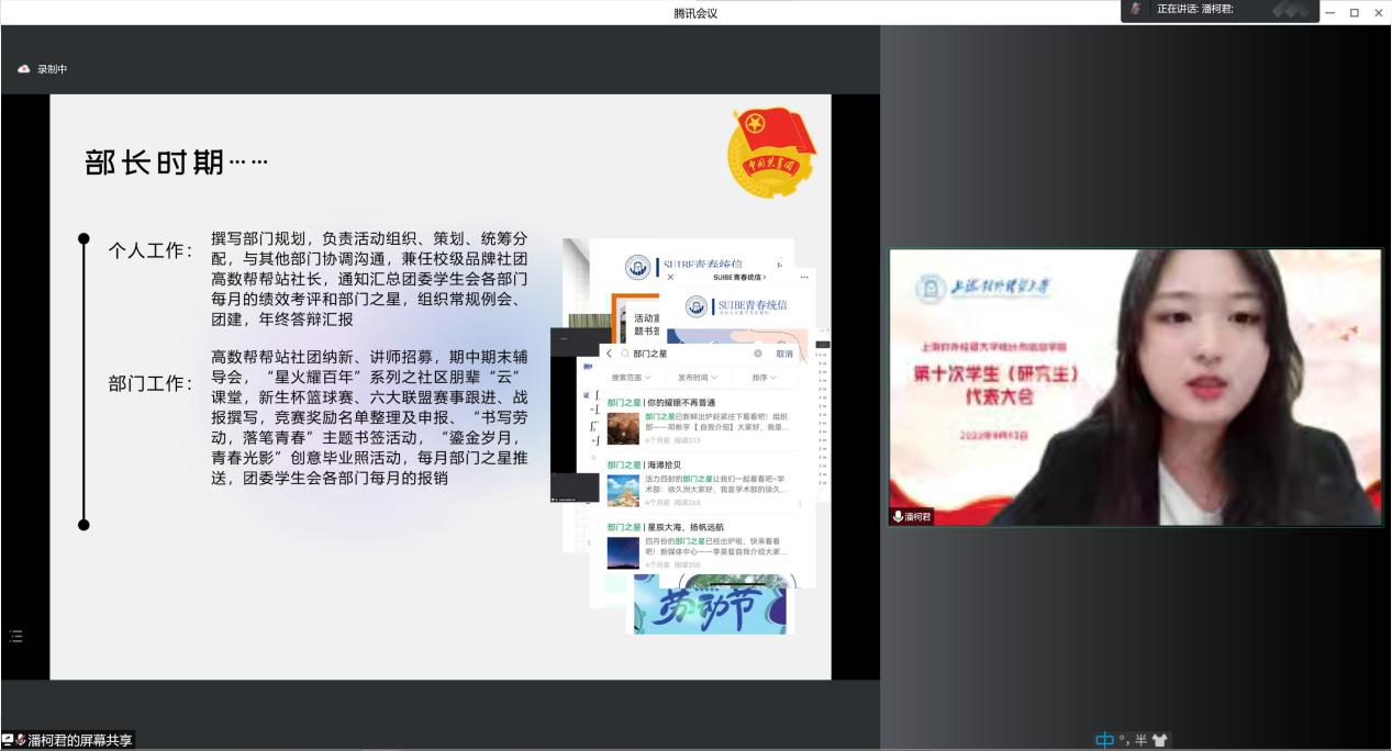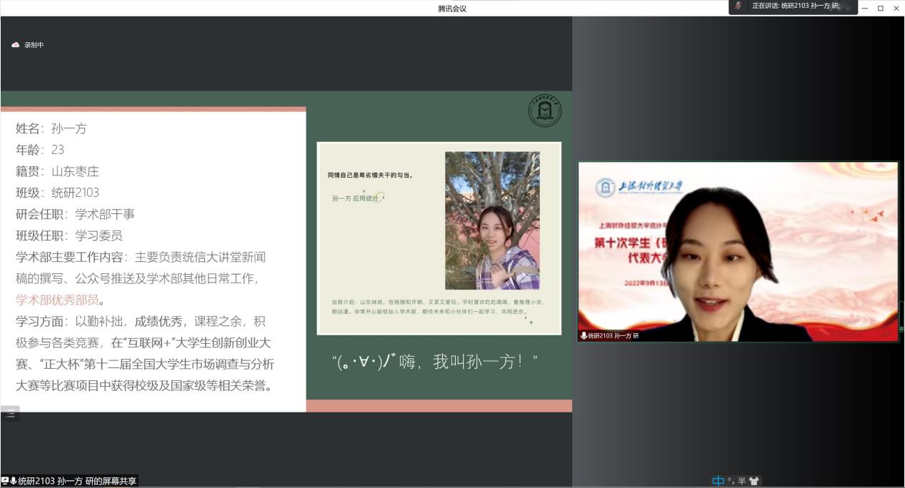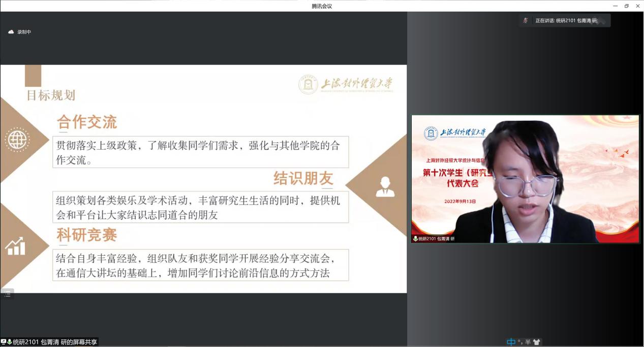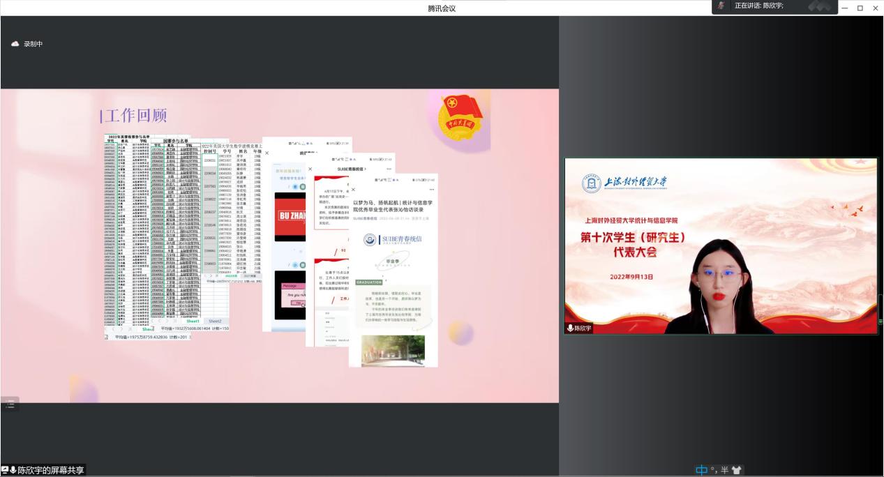 2022年9月13日,上海對外經貿大學統計與信息學院第十次學生(研究生)代表大會在線舉行。上海對外經貿大學統計與信息學院黨委副書記李睿,院團委書記肖包興邦,學生黨建主管馮越,團委副書記岳怡寒,上本科生黨支部書記楊小帆,校學生會主席團成員丁雋儀同學,院學生會主席團成員沈怡佳同學、彭欣怡同學及65位學生、研究生代表出席了本次會議,會議由院團委副書記張君鴻同學主持。