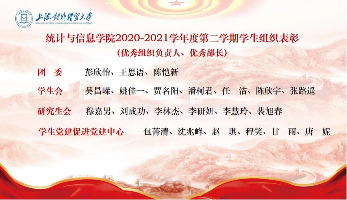 會上,院團委副書記岳怡寒宣讀了《統計與信息學院2020-2021學年度第二學期學生組織表彰學生組織表彰名單》。