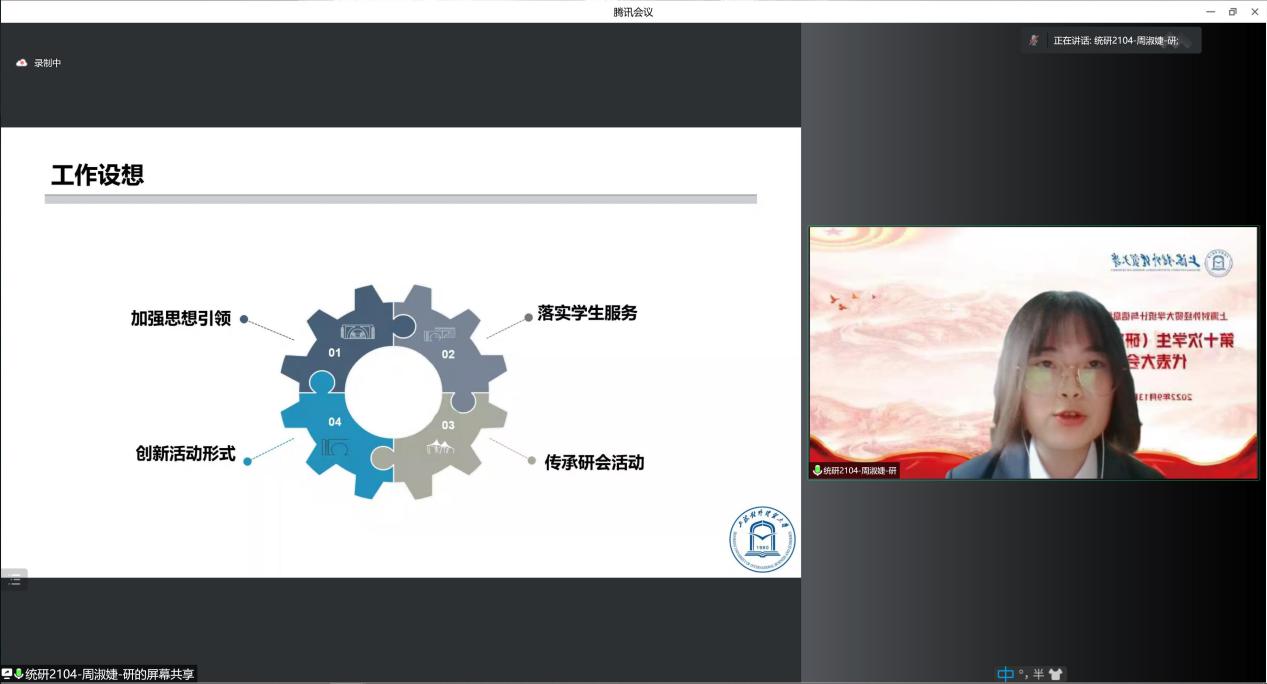 統計與信息學院第九屆學生會主席團成員沈怡佳向大會作了題為《學生為本,服務為先,助力青年夢想;激揚青春,砥礪前行,筑夢統信華章》的工作報告,回顧了過去一年學生會在“引領青年思想、傾聽青年需求、服務青年權益”的工作理念下所完成的各項工作。