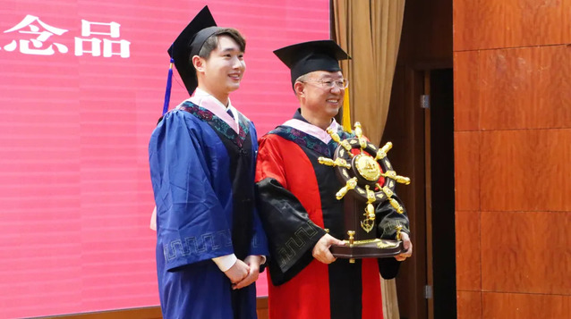 2023屆研究生畢業生向學院贈送紀念品——領航舵,寓意開拓進取、一帆風順,祝福學院在新征程上行穩致遠、乘風破浪。張日權代表學院接受紀念品。