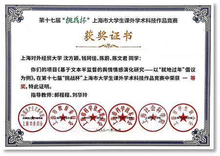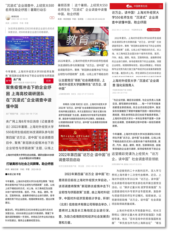 學院始終胸懷“國之大者”,以重大項目為牽引,深入經濟建設主戰場貢獻智慧和力量。對標國家戰略需求,建立跨學科研究平臺,成立商務大數據研究中心、金融大數據和精算科學研究中心等跨學科科技創新平臺,籌備成立上海對外經貿大學數據科學研究院。與海關總署共建全球貿易監測分析中心(上海),與上海市松江區政府共建長三角G60科創走廊全球貿易監測分析中心。連續4年開展“訪萬企,讀中國”大型社會調查,組織全校1200余名師生,對全國2000余家企業開展跟蹤接力式深度調研,撰寫調研報告和決策咨詢建議200余萬字,形成4部專著,項目獲新華社、光明日報、解放日報、經濟日報等媒體報道累計200余次,受到商務部和海關總署的高度肯定,被中宣部、教育部、團中央授予全國大學生社會實踐活動優秀團隊,連續3年在“知行杯”上海市大學生社會實踐項目大賽中獲獎。研制發布系列貿易指數,圍繞“一帶一路”沿線國家貿易與投資開展研究,編制和出版6部貿易指數專著,深度服務中國國際進口博覽會,在進博會上發布“中國國際進口博覽會主賓國貿易指數”“中國進口食品貿易指數”等系列貿易指數,助力國家高水平對外開放。