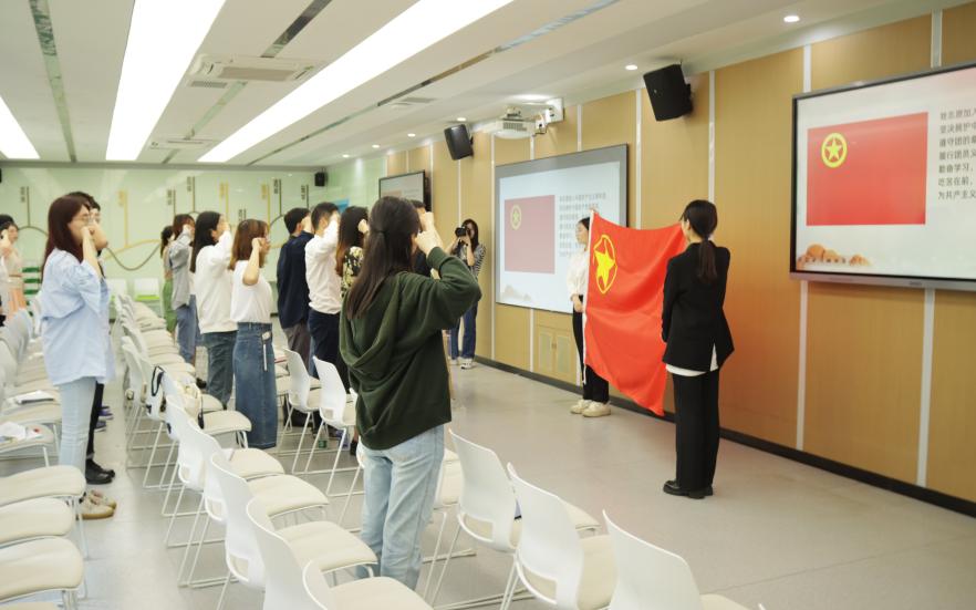麻瑞瑩老師帶領在場團員青年緊握右拳面對團旗莊嚴宣誓。錚錚誓言,字字刻骨,銘記青年之初心使命,不負韶華,矢志奮斗。