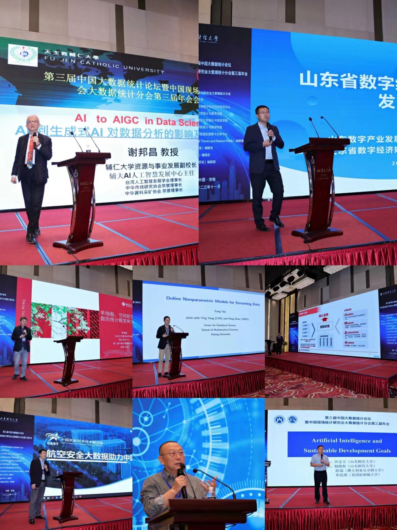11月4日的大會報告環節,臺灣輔仁大學謝邦昌副校長、山東數字產業發展研究院院長馬亮、北京大學數學科學學院研究員席瑞斌、上海華證指數信息指數信息服務有限公司董事長劉忠,北京大學統計科學中心主任姚方、中國民航科學技術研究院趙新斌副研究員、北京大學數據科學學院助理教授苗旺、北京益派數據有限公司副總裁何建新、山東財經大學統計交叉研究中心主任田金方等來自學界、業界和政界的9位專家作了大會報告。