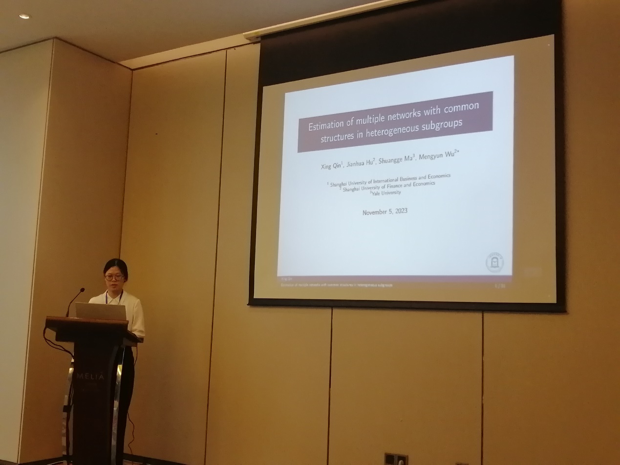 11月5日上午,論壇共舉辦了6場分會場報告,分會場主題包括:數字經濟與金融科技、因果發現和因果推斷、航空數據與行業應用、統計推斷與生物信息、高維數據與復雜數據、實驗設計與抽樣理論。共有來自全國各高校的49位專家學者在分會場報告環節做了學術報告。我院秦杏老師作了主題為《Estimation of Multiple Networks with Common Structures in Heterogeneous Subgroups》的報告,受到現場專家學者的廣泛關注。
