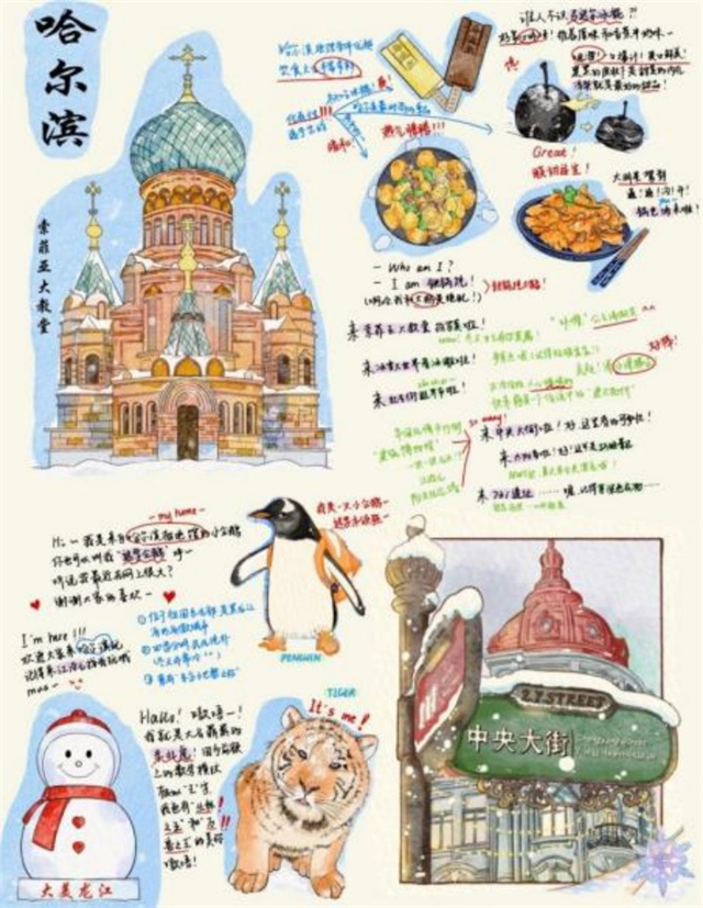 國際商務外語學院法語(商務方向)專業2022級本科生李佳頤介紹了自己的家鄉哈爾濱。看著今年紅遍全國的網紅城市“爾濱”,她倍感自豪:“哈爾濱旅游文化資源豐富,除了年初火爆全網的中央大街、冰雪大世界、哈爾濱紅腸外,還有極地公園、哈西紅場、松花江霧凇美景等。‘爾濱’是座十分宜居的城市,這里的人們熱情好客,待人友善,讓人感到賓至如歸,煙火氣息濃厚,歡迎來哈爾濱,感受冰城的魔力與熱情?!睘榇耍罴杨U從飲食、旅游資源、歷史文化等方面精心設計了一張推介海報,讓人心馳神往。