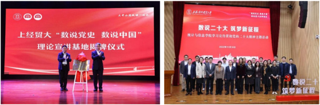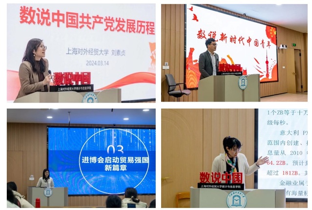 自2022年5月起,上海對外經貿大學統計與信息學院黨委推出了“數說黨史 數說中國”理論學習項目,結合學科專業特色打造“黨史+學科”學習教育模式,開展“數說”系列課程和活動。2022年11月,基于“數說黨史 數說中國”項目設計并開展了“數說二十大”系列宣講課程,成為學校黨的二十大精神學習宣講活動的鮮亮品牌。一年多來,宣講團師生走出校園,把課程送進大中小學、街道社區、田間地頭、企業車間,共計開展理論宣講活動60余場,制作理論宣講視頻20余部,累計輻射受眾萬余人次,受光明日報、解放日報、中國青年報、學習強國等20余家主流媒體報道47次,建立5個“數說黨史 數說中國”理論宣講基地和課程聯合開發計劃,形成廣泛的社會影響。2024年3月,學院進一步優化課程體系,向全校學生開設“數說黨史 數說中國”選修課程。目前課程已經講授了4個主題的課程,包括“數說中國共產黨發展歷程”“數說新時代青年”“數說貿易強國建設”“數說金融科技”。課程內容體系化、專業化、特色化,尤其突出“數字化”,師生運用數據挖掘和統計分析方法,以大量數據、圖表、分析對比和可視化的方式多維度直觀呈現黨的二十大精神,數字賦能讓課程更有說服力,讓師生更有“共鳴”、能“共情”。接下來,課程還將開展“數說脫貧攻堅”“數說共同富裕”“數說綠色發展”“數說人民生活新圖景”等多個主題課程,繼續為學生們展示中國的輝煌成就和未來發展潛力。