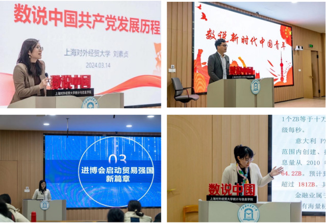 自2022年5月起,上海對外經貿大學統計與信息學院黨委推出了“數說黨史 數說中國”理論學習項目,結合學科專業特色打造“黨史+學科”學習教育模式,開展“數說”系列課程和活動。2022年11月,基于“數說黨史 數說中國”項目設計并開展了“數說二十大”系列宣講課程,成為學校黨的二十大精神學習宣講活動的鮮亮品牌。一年多來,宣講團師生走出校園,把課程送進大中小學、街道社區、田間地頭、企業車間,共計開展理論宣講活動60余場,制作理論宣講視頻20余部,累計輻射受眾萬余人次,受光明日報、解放日報、中國青年報、學習強國等20余家主流媒體報道47次,建立5個“數說黨史 數說中國”理論宣講基地和課程聯合開發計劃,形成廣泛的社會影響。2024年3月,學院進一步優化課程體系,向全校學生開設“數說黨史 數說中國”選修課程。目前課程已經講授了4個主題的課程,包括“數說中國共產黨發展歷程”“數說新時代青年”“數說貿易強國建設”“數說金融科技”。課程內容體系化、專業化、特色化,尤其突出“數字化”,師生運用數據挖掘和統計分析方法,以大量數據、圖表、分析對比和可視化的方式多維度直觀呈現黨的二十大精神,數字賦能讓課程更有說服力,讓師生更有“共鳴”、能“共情”。接下來,課程還將開展“數說脫貧攻堅”“數說共同富裕”“數說綠色發展”“數說人民生活新圖景”等多個主題課程,繼續為學生們展示中國的輝煌成就和未來發展潛力。