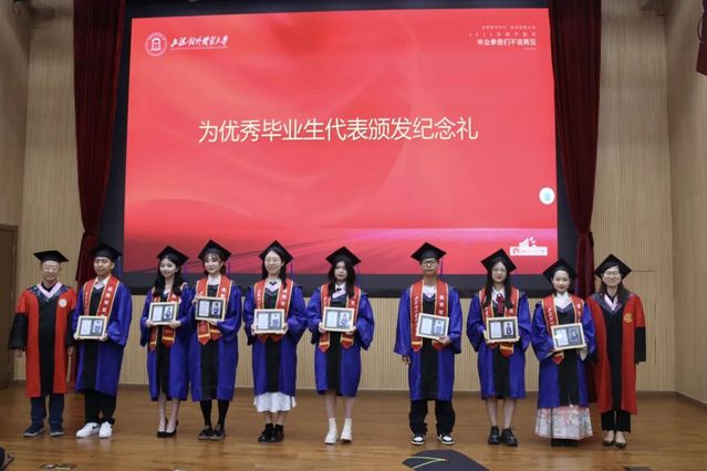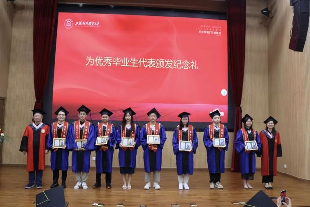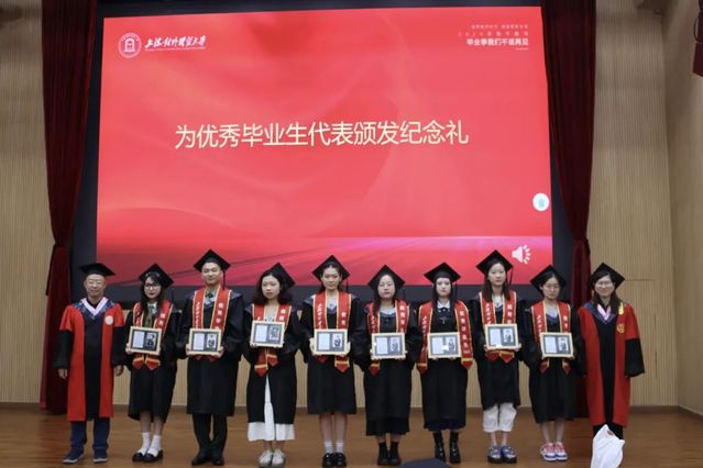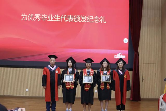 黨委書記劉素貞、院長張日權為優(yōu)秀畢業(yè)生代表頒發(fā)紀念禮。