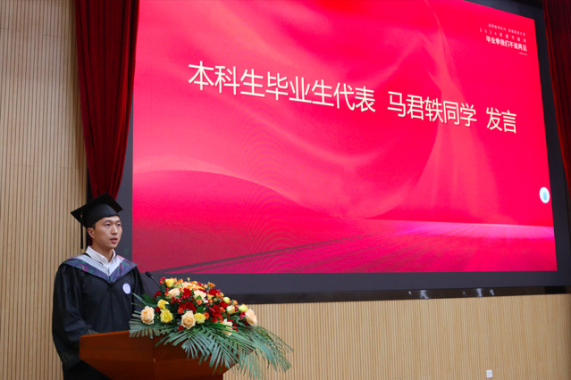 本科生畢業(yè)生代表馬君軼衷心感謝每一位老師的用心栽培和溫馨陪伴。他祝愿每一位統(tǒng)信學子,能夠不懼失敗,開拓創(chuàng)新,真正成為有理想、敢擔當、能吃苦、肯奮斗的新時代青年。