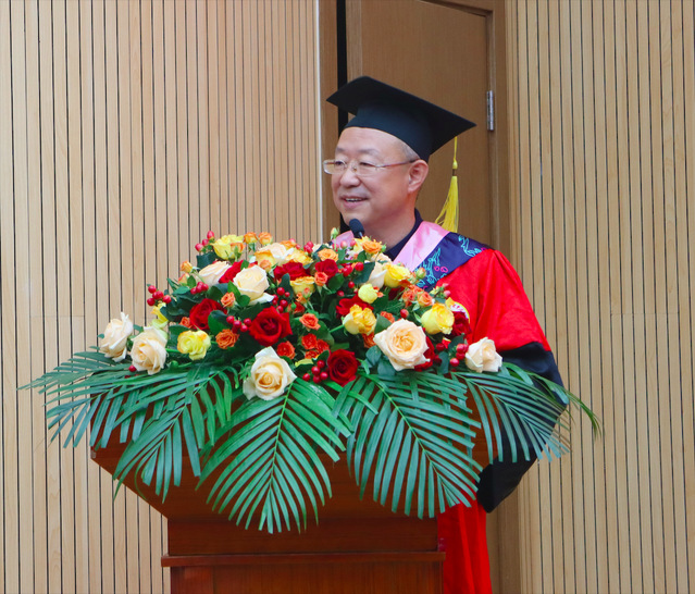 院長張日權代表學院全體教師向圓滿完成學業(yè)的畢業(yè)生們表示衷心的祝賀,向辛勤培育同學們的父母表示崇高的敬意,向悉心指導同學們的學院全體教職工表示衷心的感謝。他與全體畢業(yè)生們一起回顧了校園生活,追溯畢業(yè)生與學院一起成長的點滴。他對畢業(yè)生們提出了四點期望:一是胸懷“國之大者”,做有志青年;二是堅守“德之厚者”,做有德青年;三是把握“時之變者”,做有才青年;四是爭當“行之實者”,做有為青年。同時,他勉勵畢業(yè)生們迷茫時讀書、焦慮時運動、獨處時蓄力、失意時坦然。他期待畢業(yè)生們在接下來的人生旅途中,以更足的闖勁、更大的拼勁、更強的韌勁,肩負起推動國家富強、民族復興的重任,在強國筑夢的道路上踐行“誠信 寬容 博學 務實”的校訓精神,讓青春在實現(xiàn)中華民族偉大復興的征途中綻放絢麗光彩!