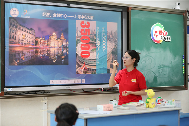在“數說上海地標”課程上,宣講團成員、大學生杜瑞芯向小朋友們介紹了上海“五個中心”建設情況。“作為國際金融中心建設的代表性地標建筑——上海中心大廈,建筑面積57.8萬平方米,容納3.5萬人,高度632米,中國第一、世界第三……”通過一系列數據的演變,小朋友們領略到了上海中心大廈的獨特魅力。
