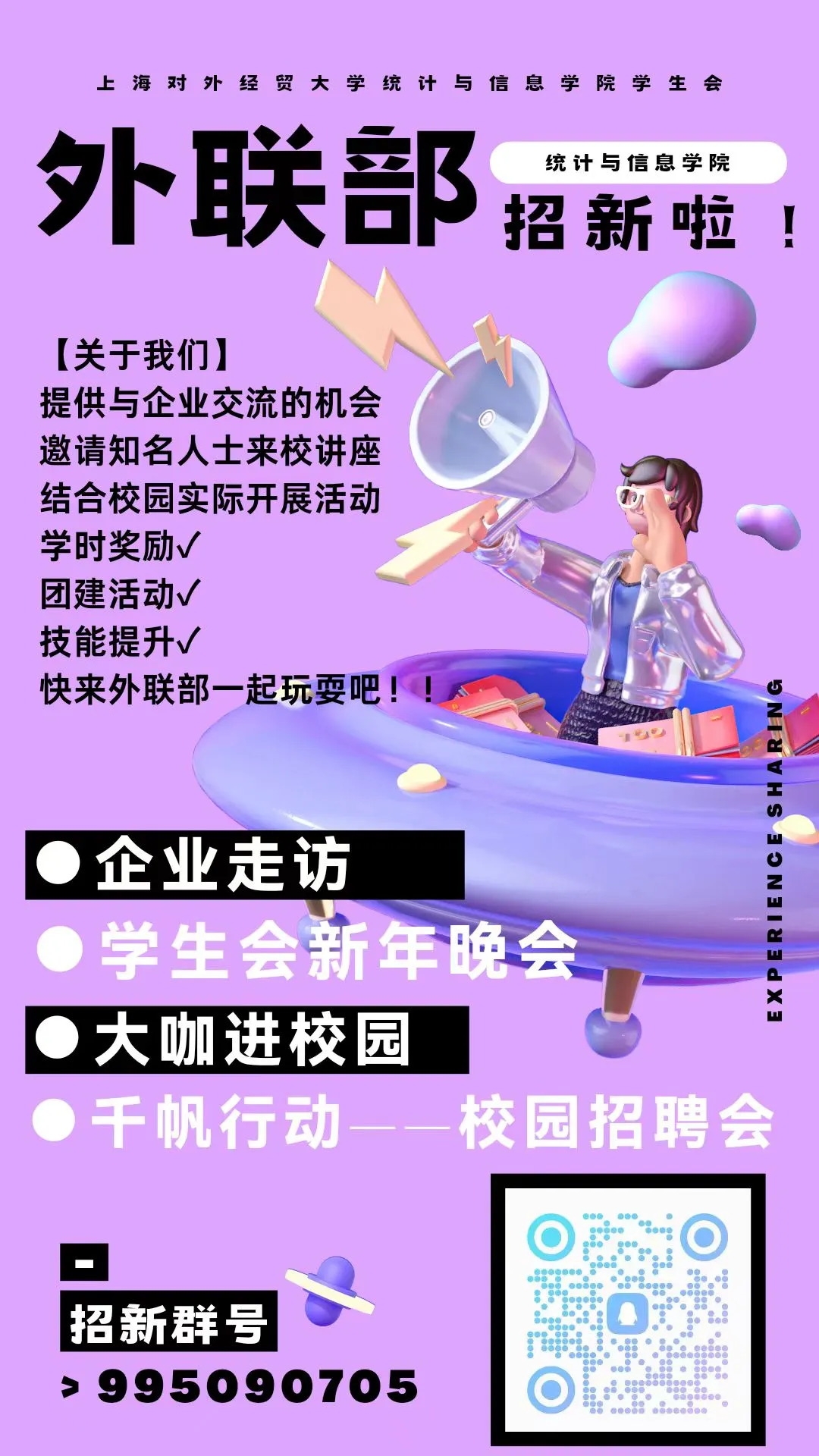 外聯部是上海對外經貿大學統計與信息學院學生會部門,是學生接觸社會、了解社會、融入社會的一個鍛煉平臺,為同學們提供與企業交流的機會,展現真我風采。