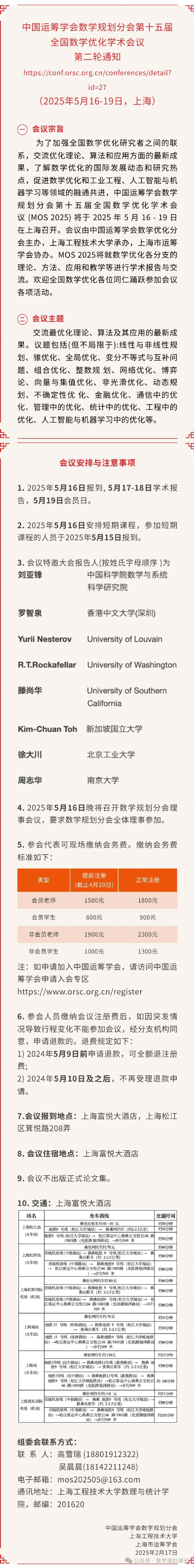 中國運籌學會數學規劃分會第十五屆全國數學優化學術會議(第二輪通知)