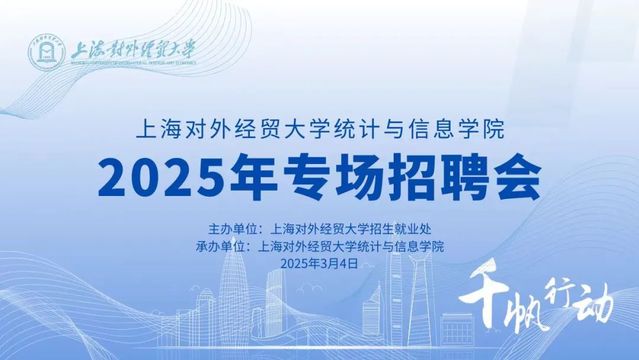 為促進2025屆畢業(yè)生高質(zhì)量充分就業(yè),深入推進校企合作交流,上海對外經(jīng)貿(mào)大學統(tǒng)計與信息學院擬于3月4日(周二)下午1:00,在上海對外經(jīng)貿(mào)大學松江校區(qū)(松江區(qū)文翔路1900號),舉行“千帆行動”2025年專場招聘會,包括2025屆畢業(yè)生就業(yè)招聘,以及在校生實習招聘。誠邀各用人單位和廣大校友蒞臨學院,廣納我院優(yōu)秀人才。
