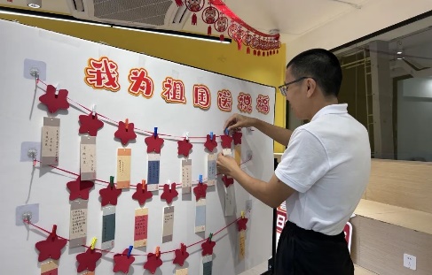 通過手工制作,師生在輕松愉快的氛圍中感受紅色文化的魅力,不僅加深了對愛國精神的理解,也用創(chuàng)意與心意表達了對祖國母親的熱愛與祝福。展覽板上的祝福語或樸實無華,或飽含深情,匯聚成一片紅色的海洋,象征著青年一代對祖國的深情厚誼。