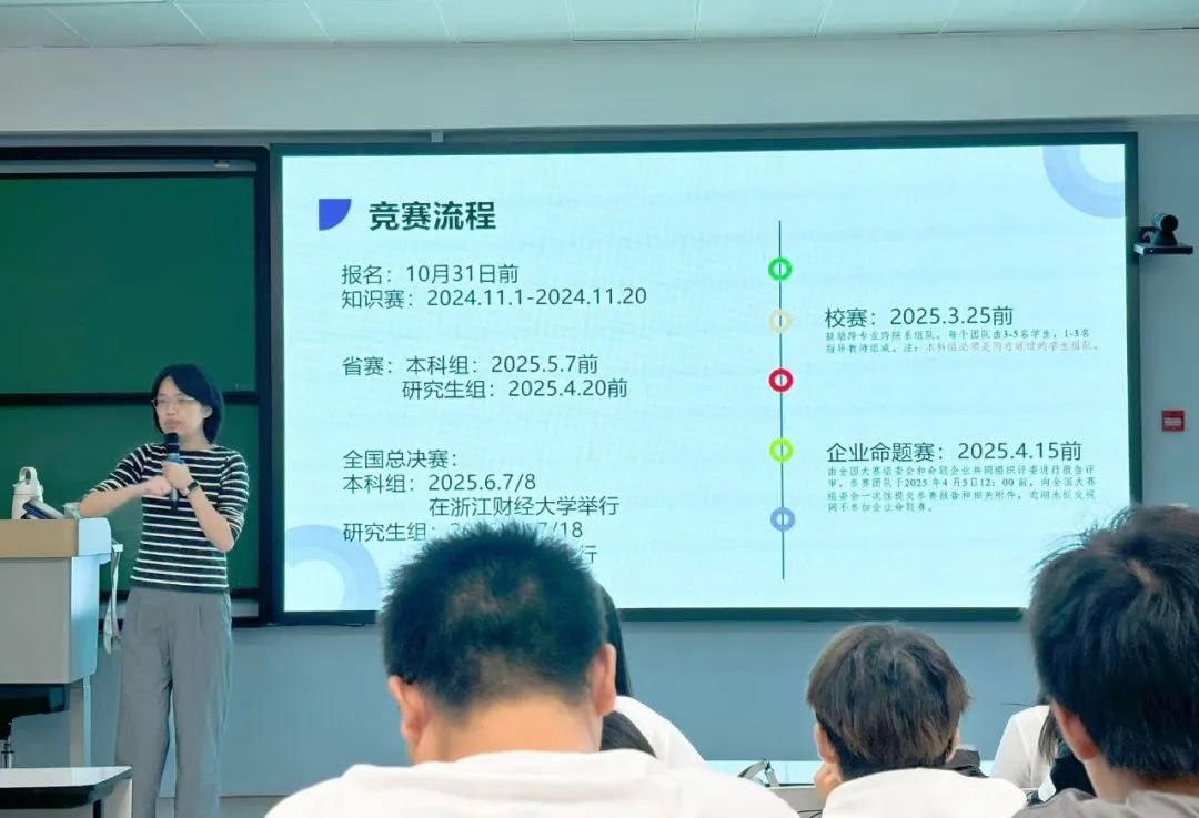 隨后,鄒老師詳細介紹了競賽的全流程,羅列出報名、校賽、省賽和全國總決賽的時間地點,為同學們分享了有關報名的具體流程。