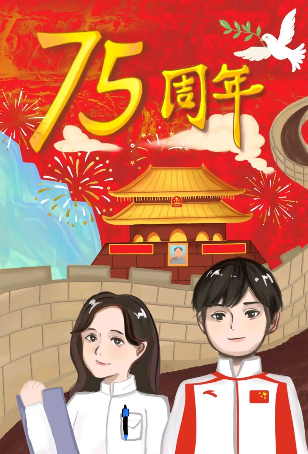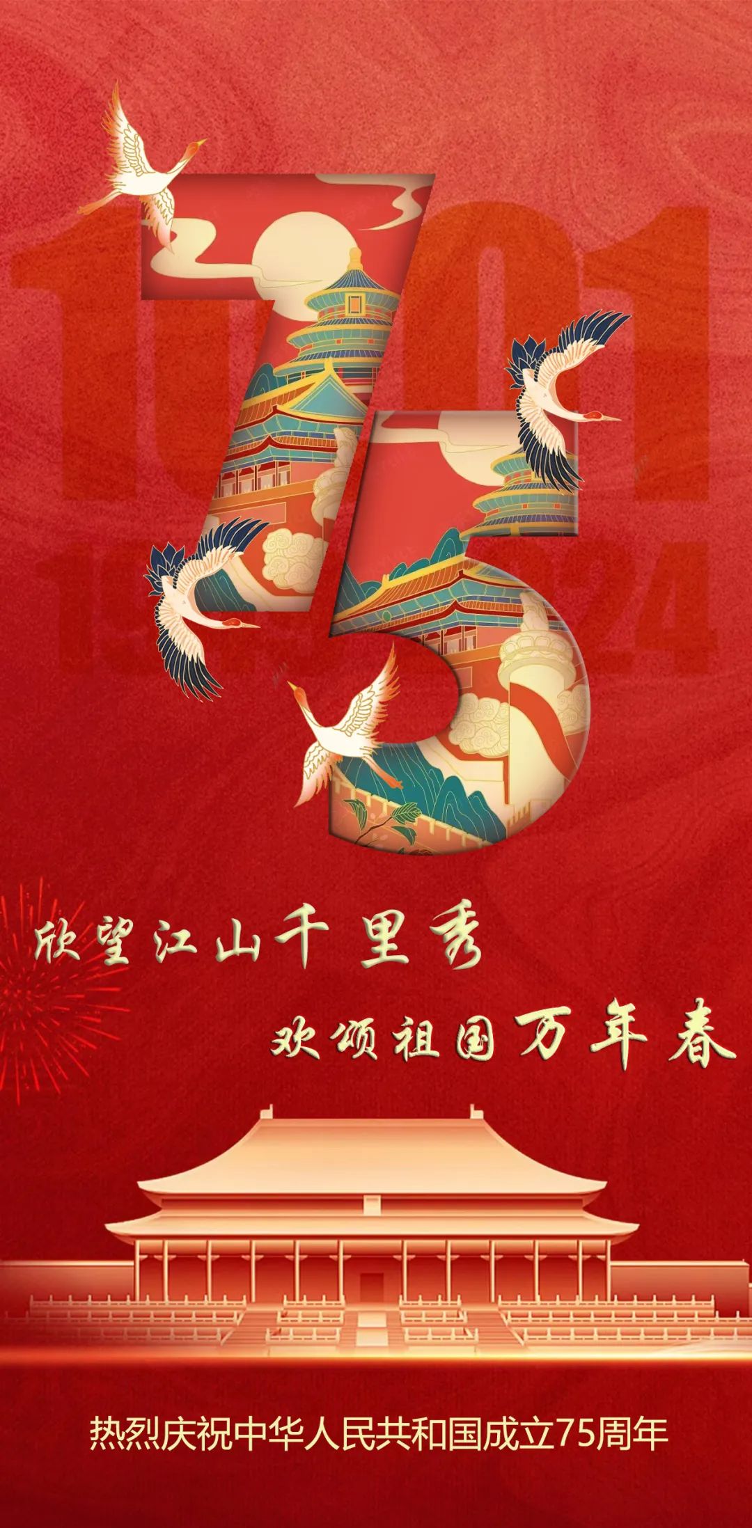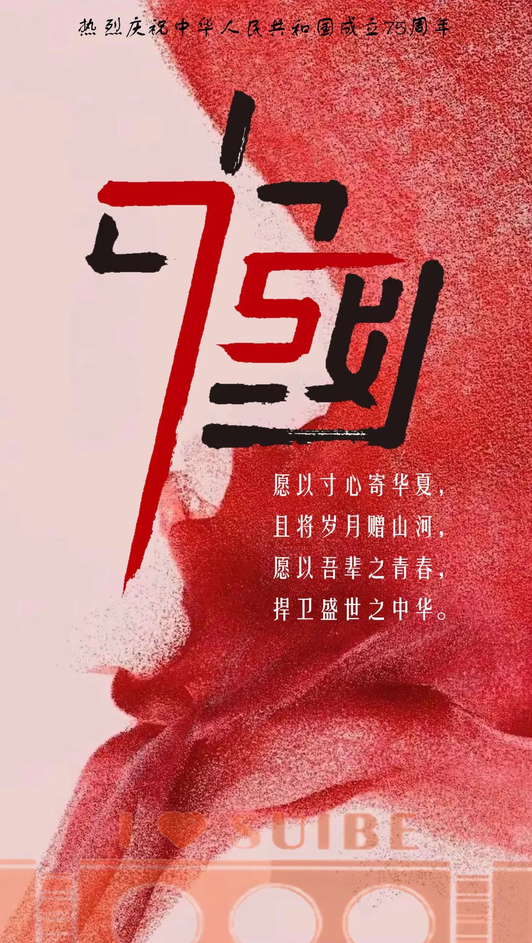 這是一張慶祝中華人民共和國(guó)成立75周年的海報(bào)。在紅色背景上,用黑色和紅褐色的字體寫著“中國(guó)”,而在“中國(guó)”中又蘊(yùn)含了“75”,表現(xiàn)出你中有我,我中有你的思想。下方有兩行文字,“熱烈慶祝中華人民共和國(guó)成立75周年”以及“愿以寸心寄華夏,且將歲月贈(zèng)山河;愿吾輩之青春,捍衛(wèi)盛世之中華”這句來自人民日?qǐng)?bào)的慷慨話語(yǔ)。這些字句傳達(dá)了對(duì)國(guó)家繁榮昌盛的美好祝愿,并強(qiáng)調(diào)個(gè)人愿意為祖國(guó)的發(fā)展與安全貢獻(xiàn)自己的青春力量。
