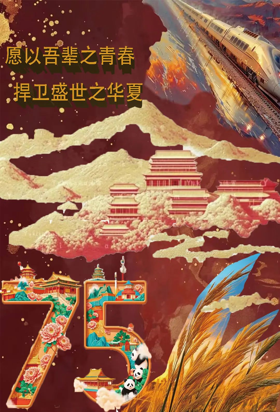 整張海報(bào)以中火紅為底色,右上角飛馳的高鐵代表著科技進(jìn)步,右下角為飽滿的麥穗,代表著新質(zhì)生產(chǎn)力的突破及人民對(duì)美好生活的向往,中間為山云及穿插在山云間的樓宇,體現(xiàn)著中式浪漫。文字部分由兩部分組成,左下角是被中國(guó)元素填充著的“75”,左上角寫著”愿以吾輩之青春,捍衛(wèi)盛世之華夏“,表達(dá)著我們對(duì)祖國(guó)母親生日的祝福及吾輩青年愿為祖國(guó)獻(xiàn)出青春的決心和意志。希望祖國(guó)越來越昌盛,人民越來越幸福。中華人民共和國(guó)萬(wàn)歲!